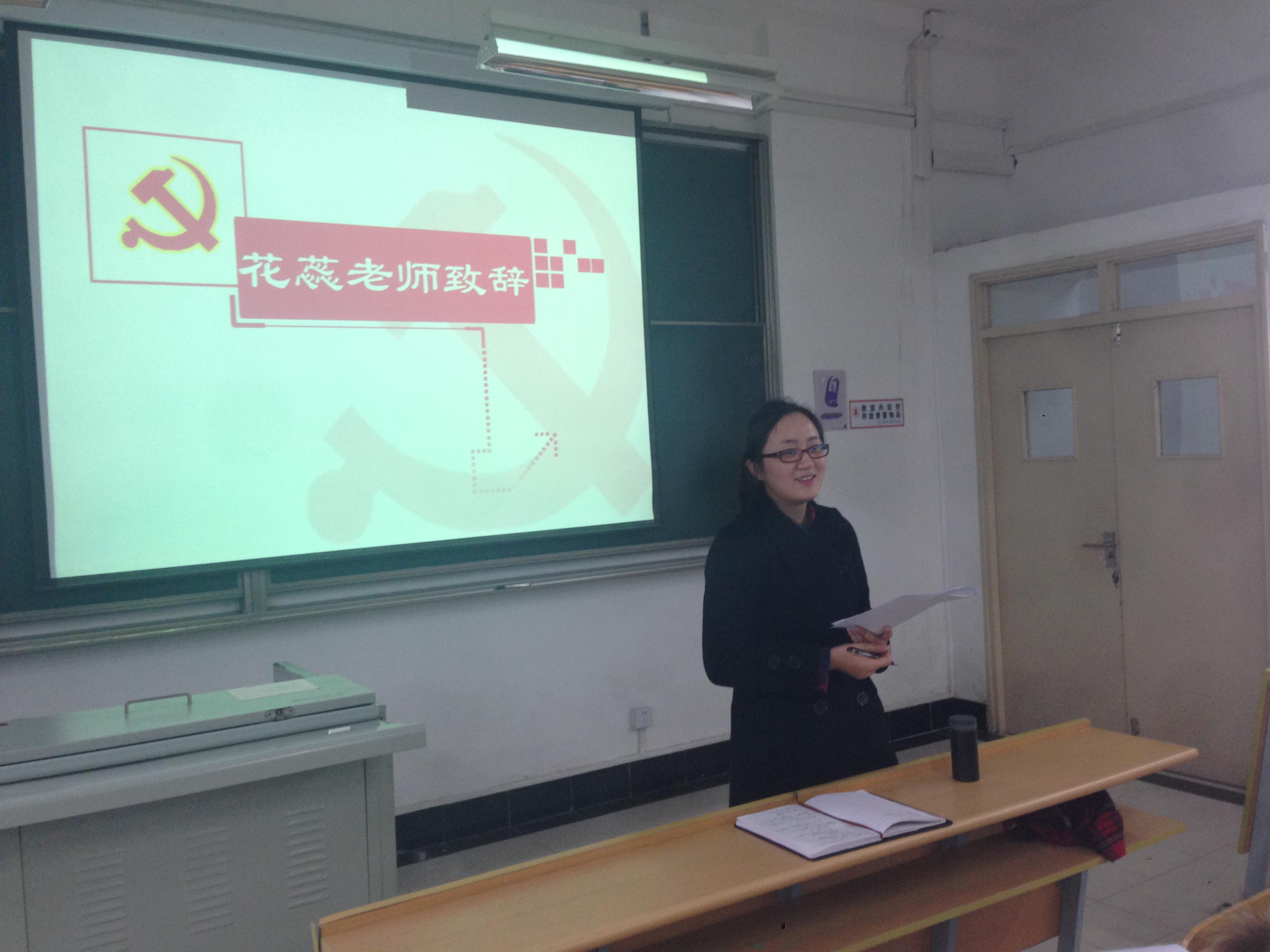 活动开始全体起立共唱《国际歌》,然后在副书记张小杙同学的介绍下正式开始了这次活动。活动中支部书记花蕊老师为我们发表了以“感恩与责任”为主题的讲话,讲话中极富感染力地向我们讲述了作为一名当代大学生,感恩的重要性,并且生动的讲述了几个例子,让同学们更加深刻的体会到做一名感恩且具有责任感的大学生的重要性,使同学们感受颇深。