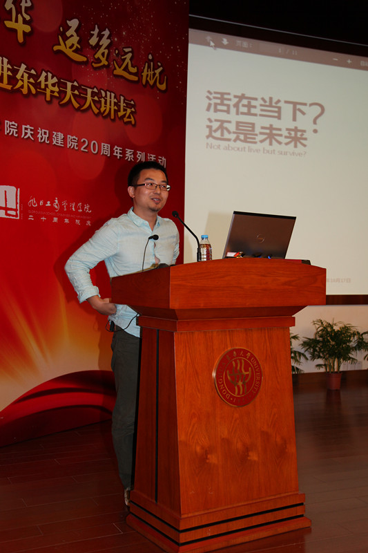 2014年10月17日晚18点30分,旭日楼400报告厅已座无虚席,来自延安路校的本科生、硕士、博士研究生、MBA学生、各界校友和部分教师共同期待着 “双十年华 逐梦远航”大师进东华天天讲坛最后一讲压轴开讲。最后一讲的主讲人成荣(洪烈)先生,现任前不久在美国震撼上市的阿里巴巴集团商务总监。成荣(洪烈)先生拥有八年传统商业从业经验,历任Baxter,Nestle等世界500企业市场经理,渠道经理等职。他于2009年加入阿里巴巴,先后担任阿里软件资深市场经理,B2B业务总监,负责SaaS软件的市场和运营,之后全面负责淘宝网生活服务、社区联盟、B2C入淘以及全网联合营销等各项电商业务。