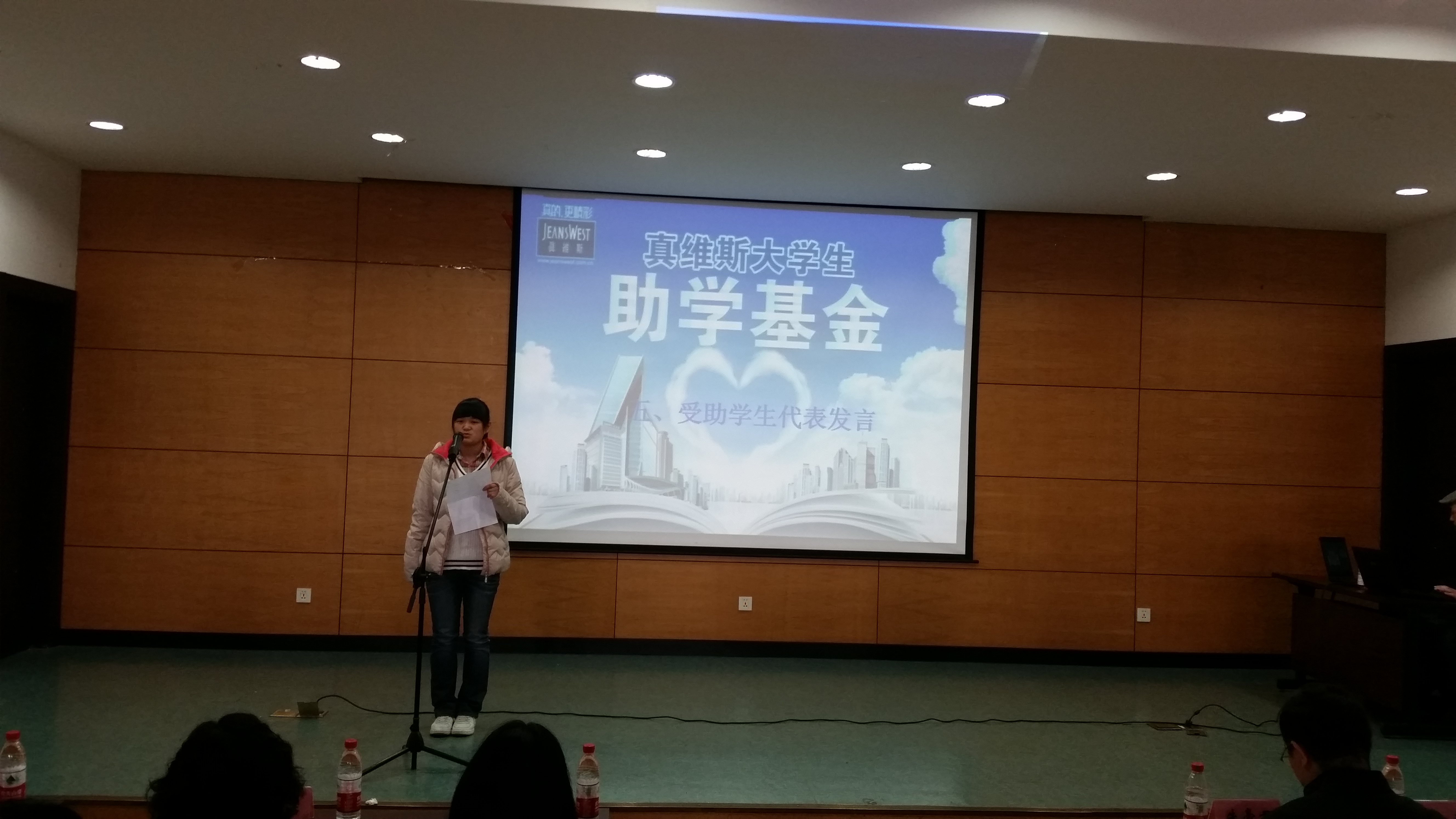 仪式伊始,由主办方主持人介绍出席嘉宾,并由嘉宾为我们本学年真维斯助学金获得者颁奖。随后,91直播 陈宁芳同学作为91直播 受助学生代表上台发言,发自肺腑的感谢和真真切切地体会感动了在场所有人。最后,真维斯人事处的负责人为我们本学年新获得助学金的同学进行岗前培训,力争让受助学生将来进入真维斯店铺实习打下良好的基础。