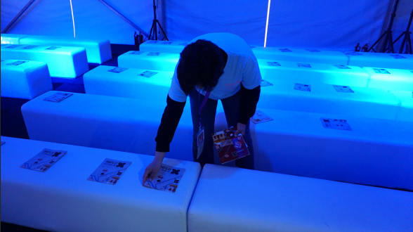 午休之后,志愿者们于下午三点钟进入秀场,各自负责相应岗位的工作。前场志愿者负责摆放秀场座位上的图册,在来宾入场时为其引导就坐,并按要求维持好现场秩序,与此同时后场志愿者为即将开始的比赛做最后的准备工作。