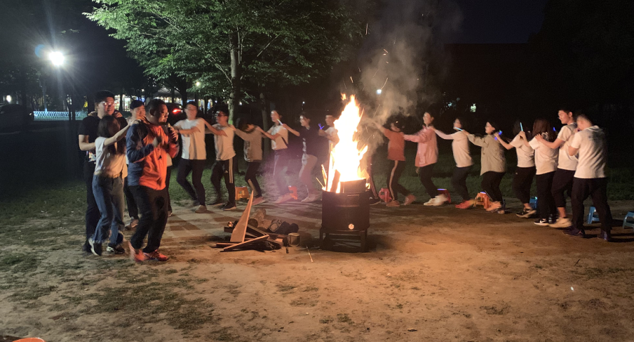 篝火晚会:相信篝火晚会是给同学们留下最深刻印象的活动。在新教练的带领下,同学们跳了1小时有余的舞蹈,长蛇穿门,群魔乱舞,小小的场地,充满着大大的欢乐。经过一天的劳累,同学们在篝火晚会尽情挥洒汗水,没有丝毫的慵懒,密切的合作与新颖的创意,相信班干们也舞出了工商91直播 高水平人才应有的风采。