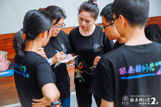 在雷声教练的指导下,同学们首先报数分成了两队,然后各自选出自己的队长、起队名、设计队旗和口号。我很“不幸”地被大家推举成为了“吸睛队”的队长,伴随着“戏精戏精,处事不惊”的口号开始了整个特训营的征程。说实话,在成为队长的瞬间,我感受到的压力要大于兴奋,因为大家都是非常出色的队友,如果作为队长不能让大家很好地团结凝聚在一起就一定是失败的。