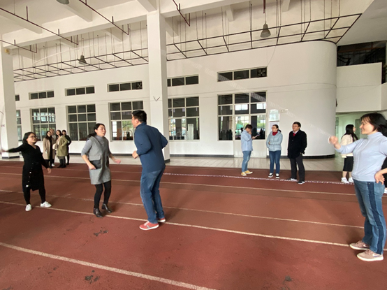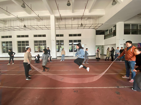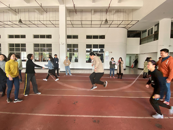 第一天中午的活动是跳长绳比赛,老师们有的当起甩绳人,有的化作跳跃的精灵在长绳间飞舞,两根长绳老师们分别进行了“8字跳”与“1字跳”的项目,“8字跳”要求老师们一个接一个穿梭于绳间讲究时机与连贯,而“1字跳”则考验着老师们团队协作与耐力。