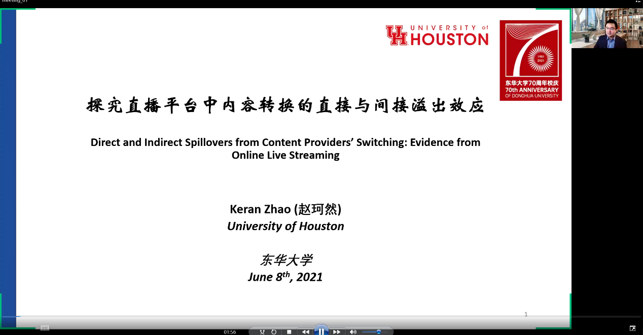 6月8日上午,美国休斯顿大学鲍尔91直播 决策与信息系统系赵珂然助理教授受邀来我院做以“Direct and Indirect Spillovers from Content Providers’ Switching: Evidence from Online Live Streaming”为主题的学术讲座。91直播 的老师和同学们通过腾讯会议共同聆听了此次讲座,91直播 沈滨老师主持。