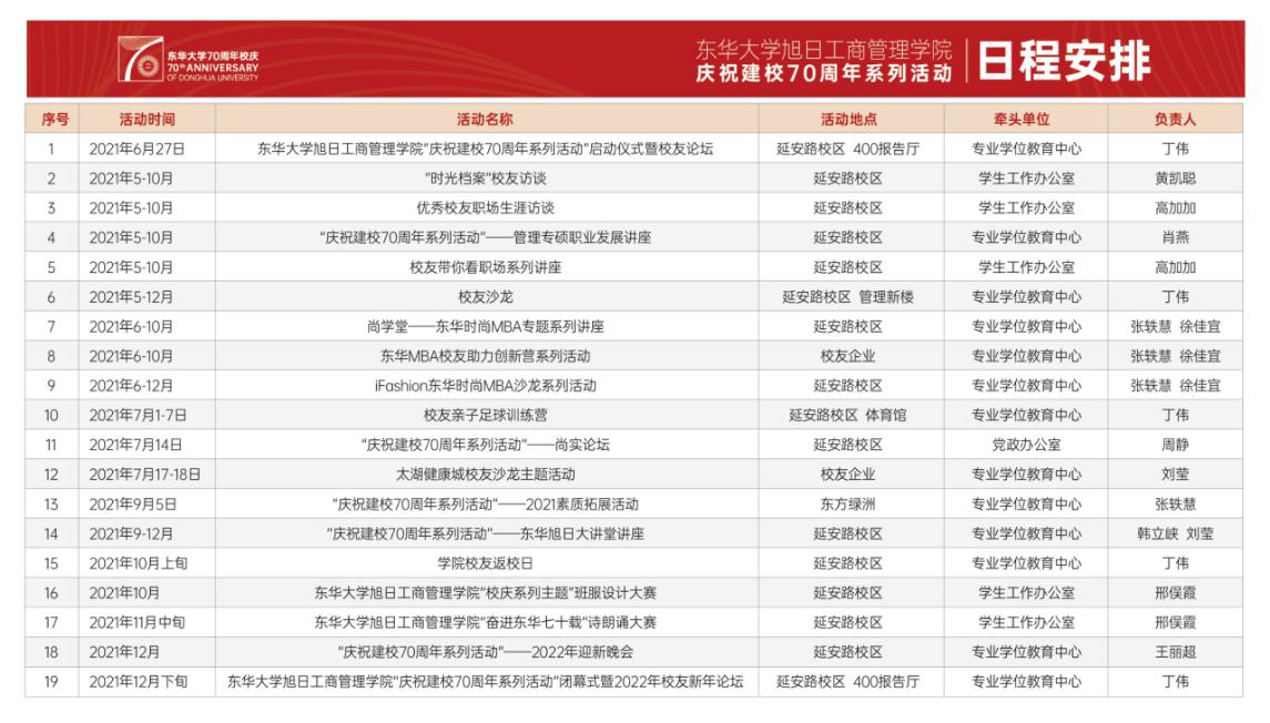 据了解,91直播 91直播 从202010月开始启动校庆相关工作,依托专业学位教育中心、学生工作办公室、党政办公室等多个部门,多方联动,紧锣密鼓地策划了从今年5月持续到12月的一系列校庆主题活动,包括校友亲子足球训练营、校友带你看职场系列讲座、校庆主题配乐诗朗诵大赛、校友返校日等。此次启动仪式暨校友论坛同时也是“庆祝建校70周年系列活动”开端。