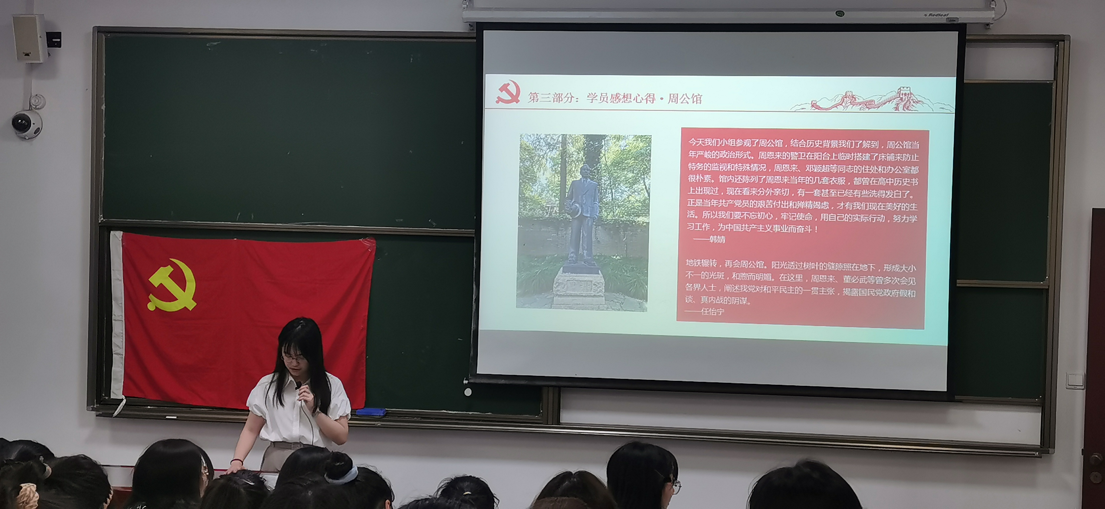接下来是十个小组分别进行入党积极分子培训班学员“乘坐红色列车,寻访党史故事”主题活动成果展示,各小组采用PPT的方式,向大家介绍了周公馆、宋庆龄陵园、中共一大会址等红色教育基地,对入党积极分子们学习红色精神,传承红色基因,不忘初心、牢记使命、锤炼品格具有重大意义。