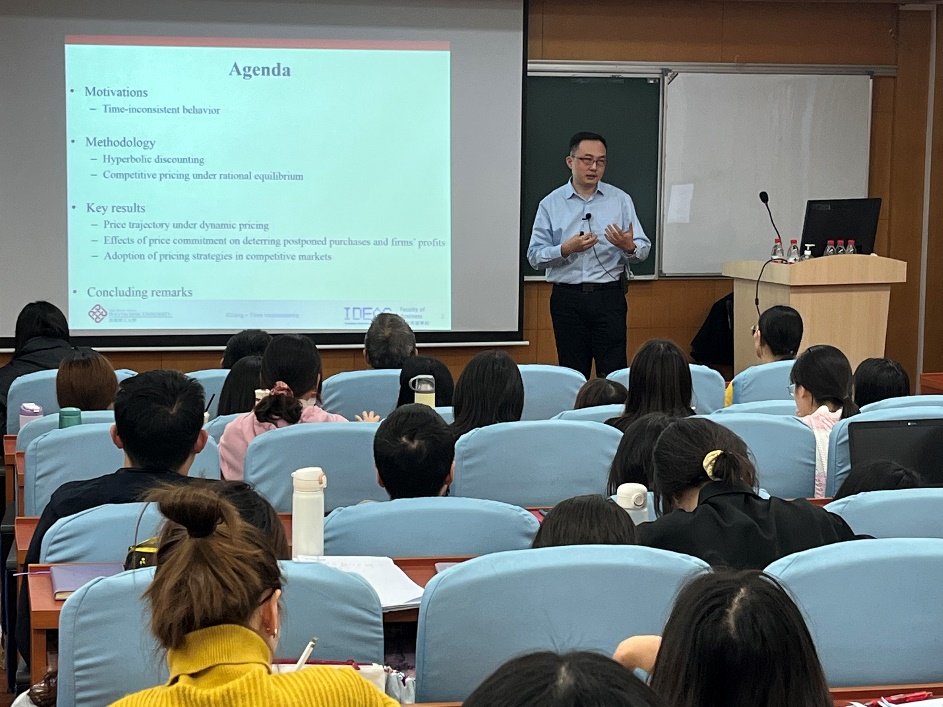 2021年10月21日(周四)下午14:00,香港理工大学工商91直播 姜力教授受邀来我院做以“Selling to Time-inconsistent Consumers”为主题的学术讲座。本次报告会由副院长李庆颖教授主持,91直播 的老师和同学们在旭日楼211教室共同聆听了此次讲座。