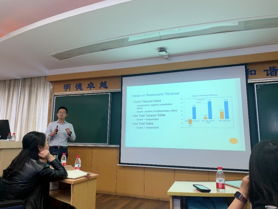 会上,王老师以外卖市场为切入点,围绕“外卖平台对实体餐馆的影响是利是弊?”,“外卖平台对连锁餐馆/中小型餐馆分别带来什么影响”,“加入外卖平台后,餐馆收益增加/减少是为何?”等问题展开讲解。分析表明,外卖平台对餐馆收益的影响具有异质性,其影响作用取决于餐馆类型和客户类型。