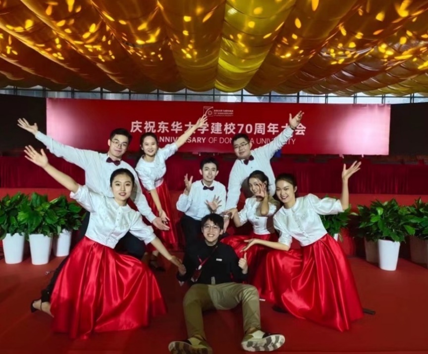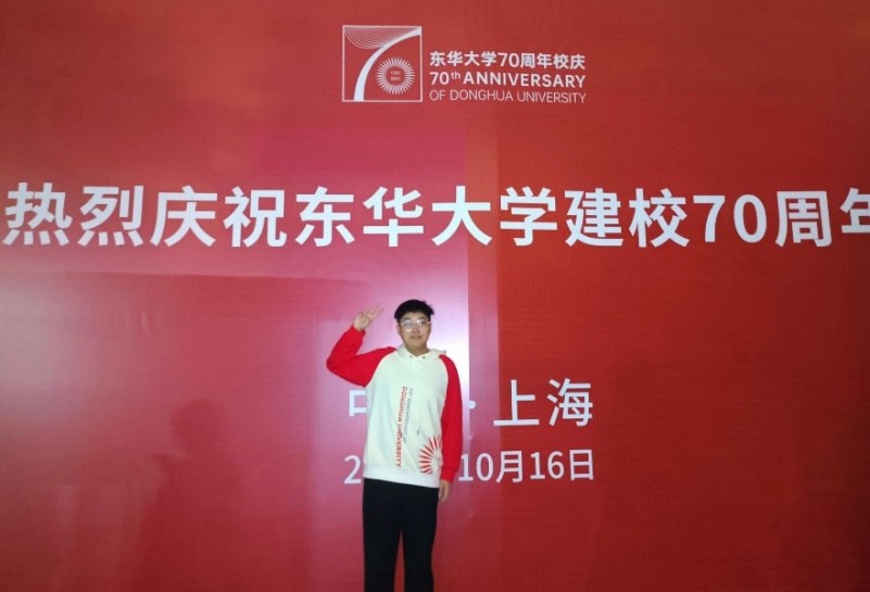“有幸在校庆大会上作为领诵参与学生献词环节,为我在母校的演艺生涯添上了浓墨重彩的一笔。在这期间,排练免不了辛苦,然而与收获的友情以及回报母校的成就感相比,所有的汗水都微不足道。栉风沐雨七十载,薪火相传创佳绩,东华人始终怀揣衣被天下,惠泽众生的理想,做祖国和人民最需要的事业。‘不为一己求安乐,愿作别人嫁衣裳’这句词我曾在不同的场合说过不止一次,然而时诵时新,奉献精神,大局意识将成为刻在我们骨子里铮铮作响的最强音!”
