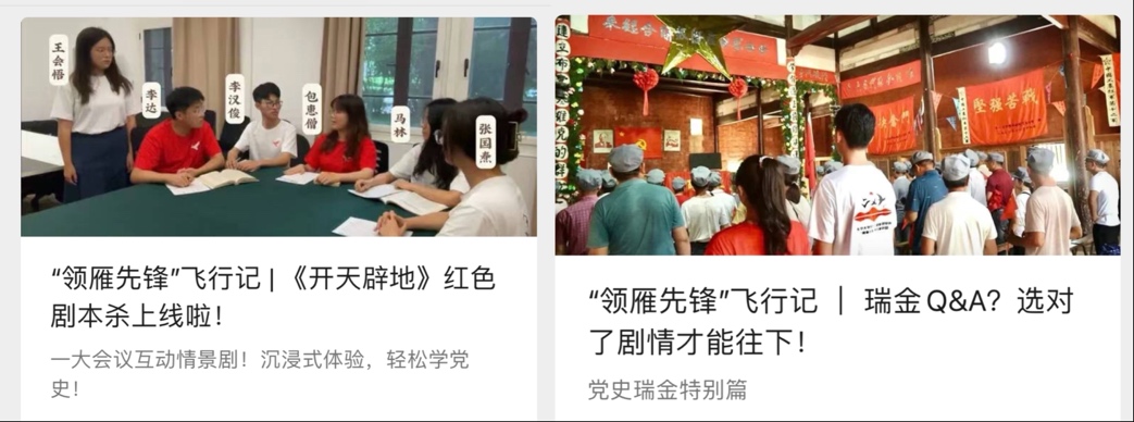 “领雁先锋”学生宣讲团自成立以来,致力于以青年之声传承红色基因、传播红色文化,暑假期间,继续搭建好有高度、有力度、有温度的党史教育“立体课堂”,宣讲团依托社会实践,从上海出发,先后前往江西瑞金、浙江嘉兴,边走边讲,以互动问答打造瑞金式青年大学习,以互动剧本引导观众决定剧情选项,深刻感悟党的成立来之不易。