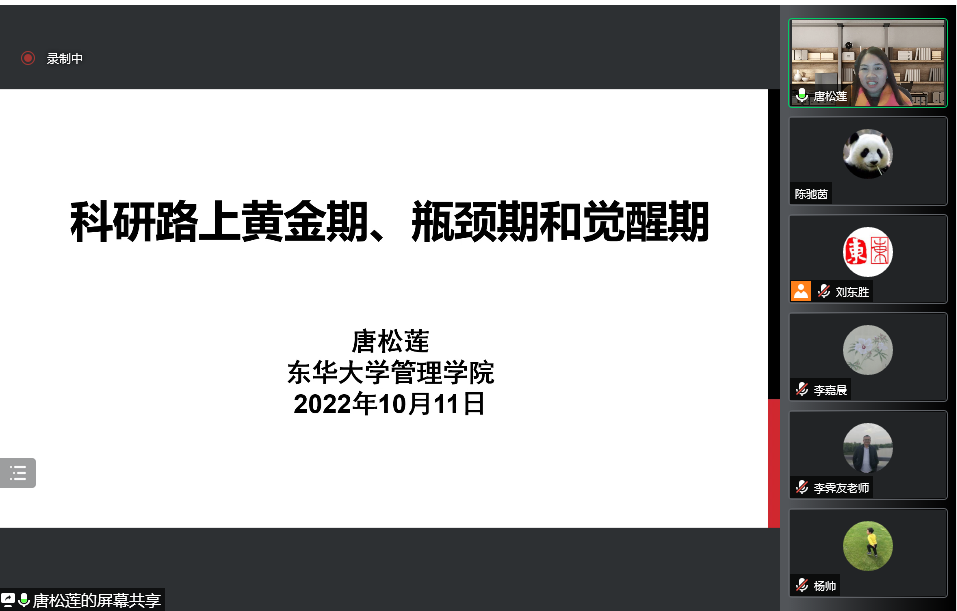 20221011日下午1330,91直播工商管理系举办在线教学科研研讨活动,由唐松莲教授以《科研路上的黄金期、瓶颈期、觉醒期》为主题,与工商管理系老师分享了科研教学心得。
