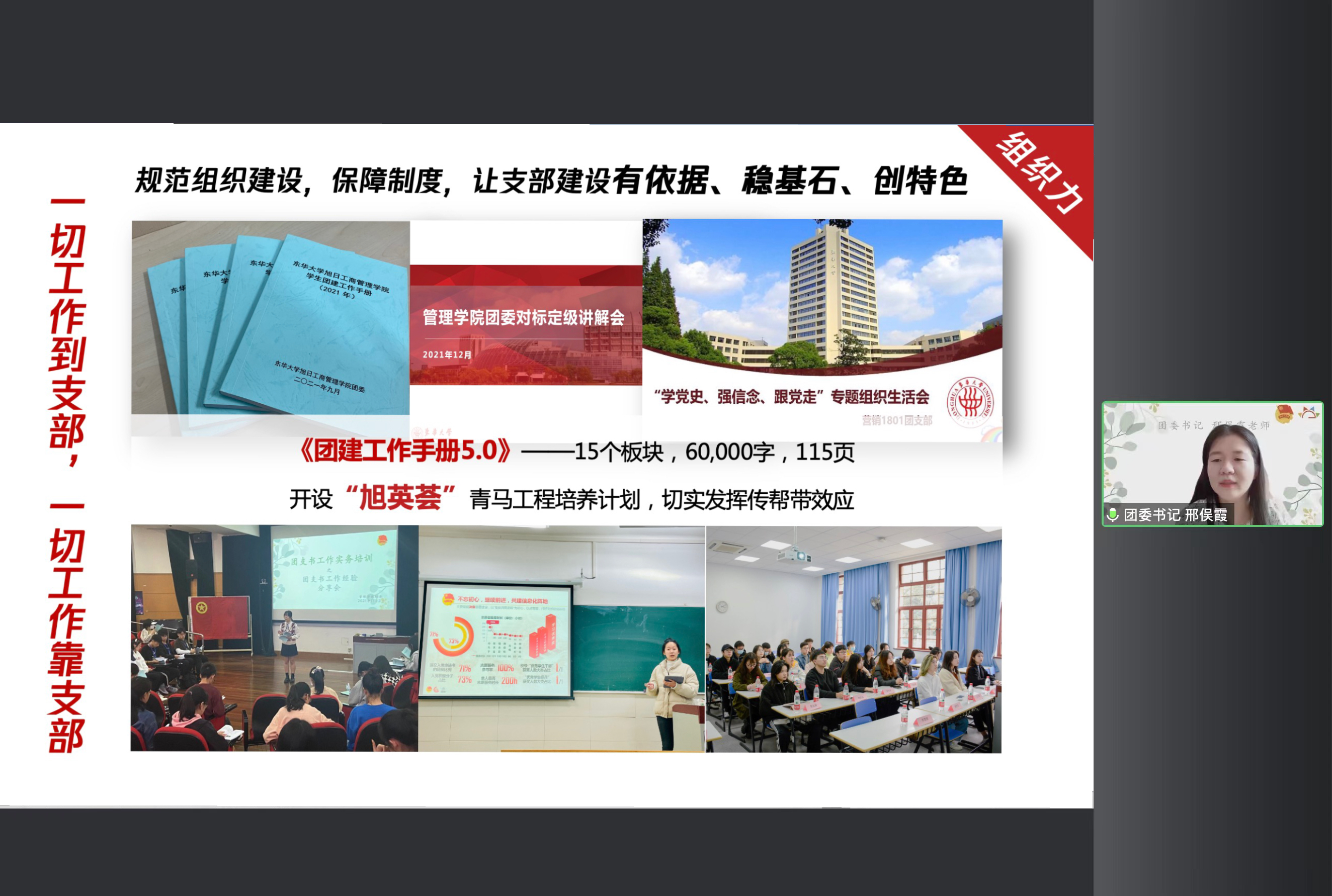 分享会还邀请了优秀团支书代表财务2101吕蕙宁进行经验分享,她结合自己过去一年的工作,重点围绕青年大学习、主题团日、大型活动组织、团员管理等展开,分享了自己在工作中的一些经验。同时,她提到了怎么干好团支书的工作,要学会利用办公小程序,学会分配任务,提高办事效率与质量,把握时间节点,也在工作中收获了责任的力量与集体的幸福感。