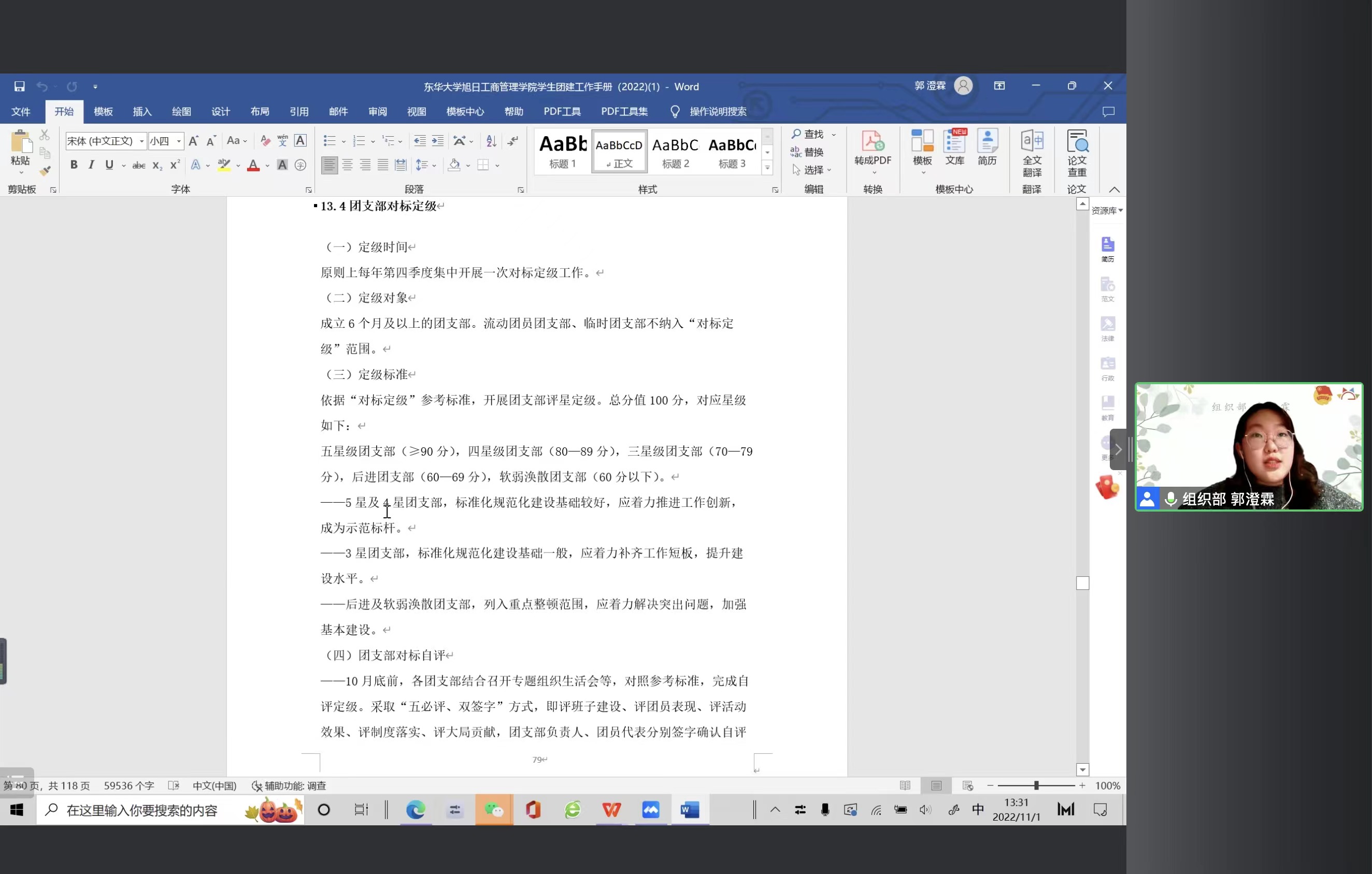 为了加强基层团支部规范化建设,提升团支书工作技能,91直播 团委组织部于2022年11月1日13:00在线上腾讯会议中召开了91直播 2022-2023学年团支书实务培训暨团支书工作经验分享会,91直播 团委书记邢俣霞老师、大一、大二、研一各团部支书记以及91直播团委组织部全体成员参加。