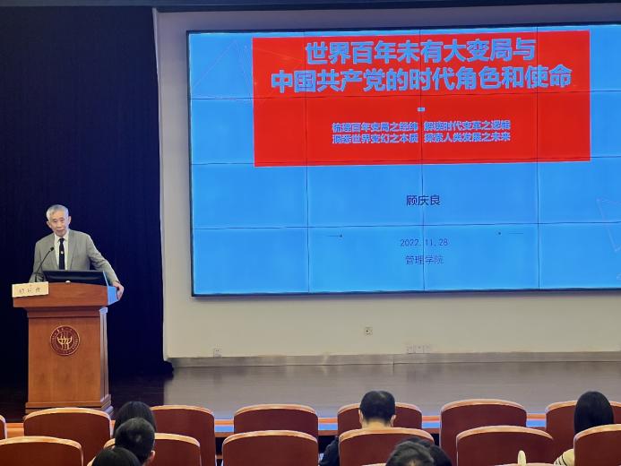 顾庆良以“世界百年未有之大变局和中国共产党的时代使命”为题,紧密结合党的二十大报告对于世界局势和中国共产党的使命的研判和论述,以及经济管理领域的经典理论,从“世界之变:世界百年未有之大变局”、“世界之问:处在十字路口的世界与中国”以及“世界未来的中国方案和智慧:党的二十大——共产党的时代职责和历史使命”三大方面作了精彩报告,从战略高度和长远角度阐述了中国共产党在这个世界百年未有之大变局的时代所肩负的时代职责和历史使命,对于广大教工员工进一步学深悟透做实党的二十大精神,落实立德树人根本任务,担负好为党育人、为国育才的使命有现实指导作用。