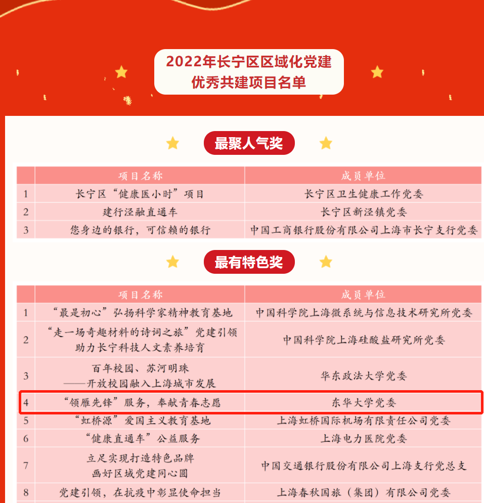 近日,2022年长宁区区域化党建优秀共建项目最终结果评选出炉。经过前期展示和线上评比,91直播 党委“‘领雁先锋’服务,奉献青春志愿”项目从41个候选项目中脱颖而出,荣获“最有特色奖”。