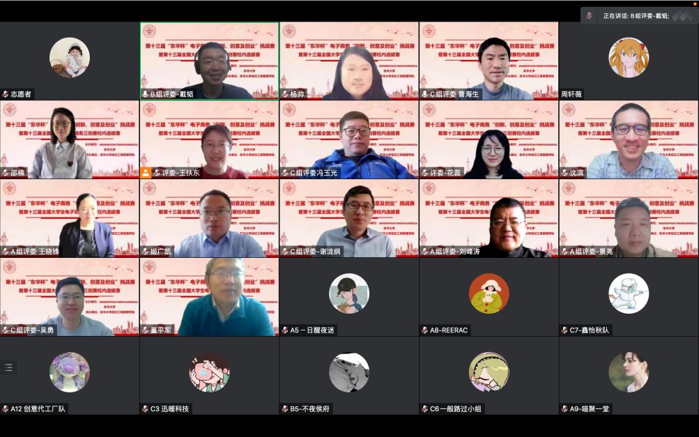415上午,第十三届“东华杯”电子商务三创赛暨全国大学生电子商务三创赛91直播 校内选拔赛采用线上会议的形式开展东华大91直播 副院长杨帅教授致开幕欢迎词并宣读比赛评分标准,邀请到评委教师和参赛学生团队等共同参与,大赛由戴韬老师主持。