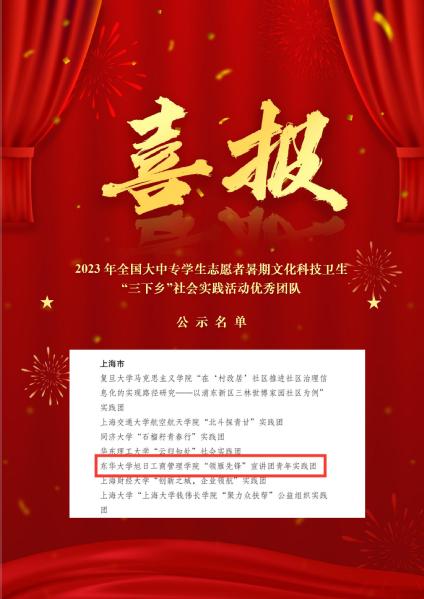 近日,共青团中央对2023年全国大中专学生志愿者暑期文化科技卫生“三下乡”社会实践活动表现突出的单位、团队、个人和成果进行通报表扬,管理91直播“领雁先锋”宣讲团青年实践团获评“三下乡”社会实践全国优秀团队,为91直播在该国家级社会实践赛事上的首次获奖,实现历史性突破。