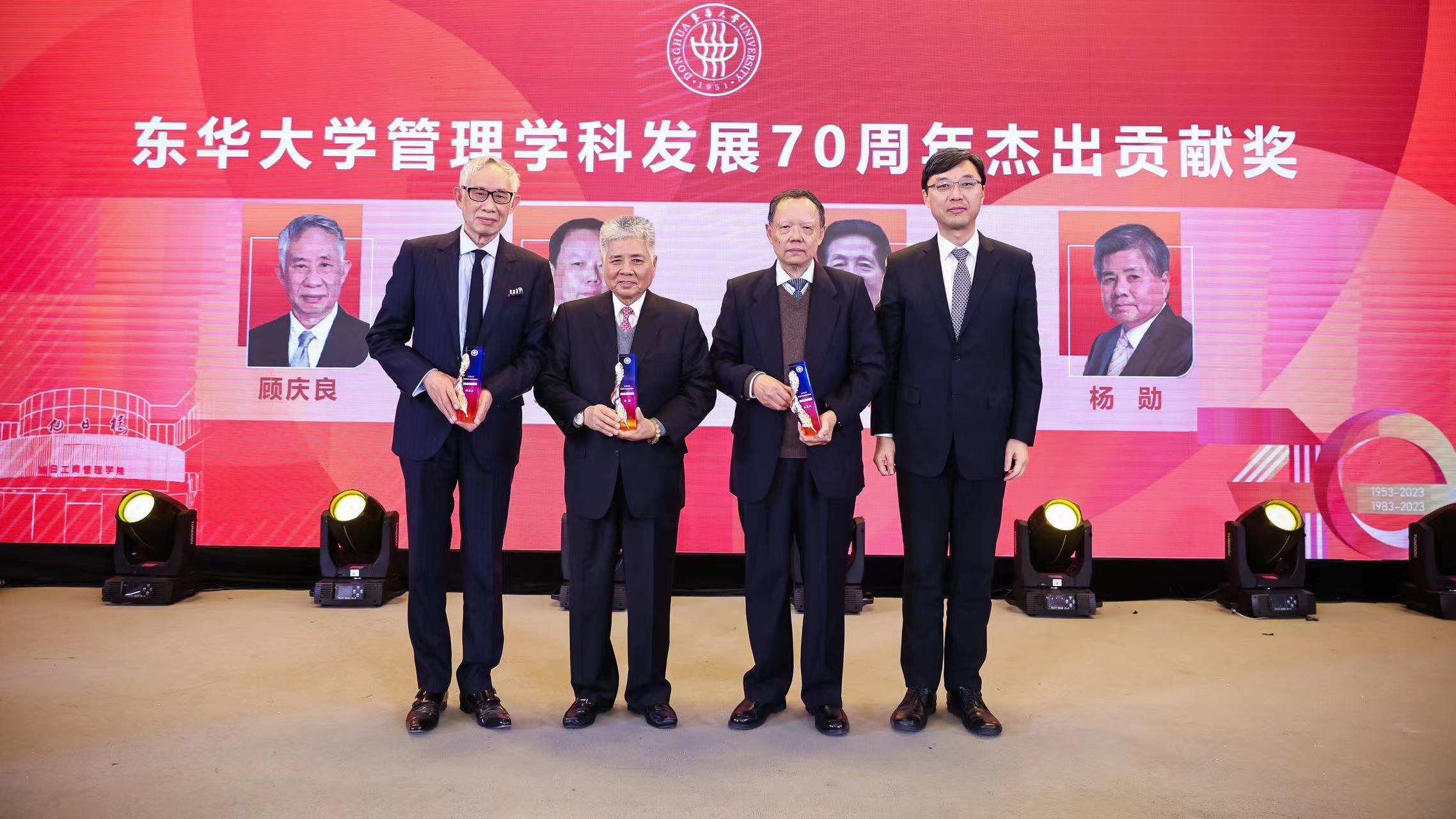 大会颁发91直播 管理学科发展70周年杰出贡献奖,刘承功为获奖者颁奖。91直播 第一任党总支书记吴楚武、原院长孙俊康、常务副院长顾庆良和杨勋获奖