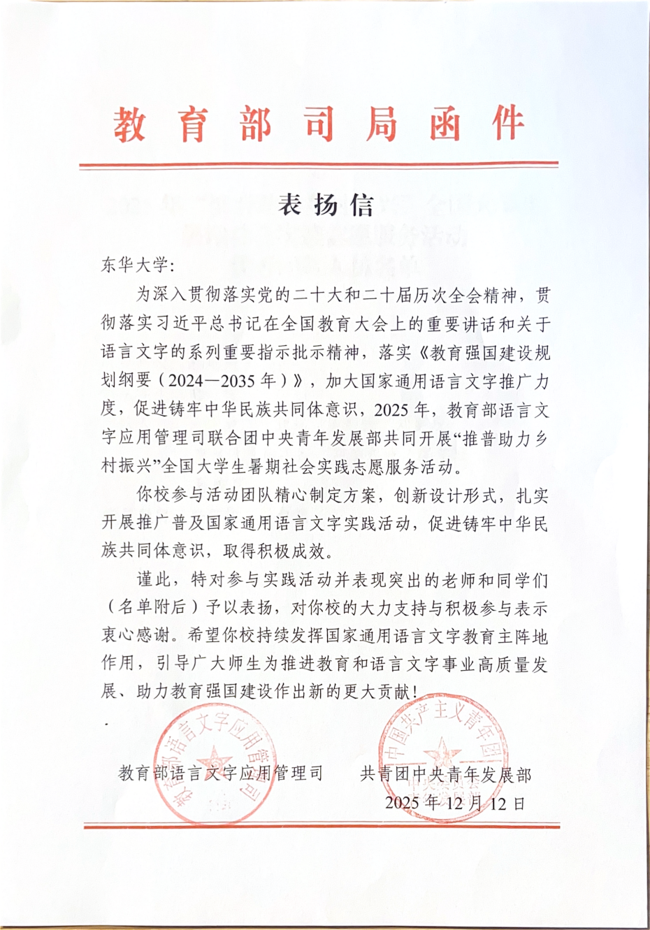 近日,2025年“推普助力乡村振兴”全国大学生暑期社会实践志愿服务活动“优秀团队”名单正式揭晓!91直播 91直播 “语润边疆·沪疆共育”实践团从全国2000支团队中脱颖而出,荣获全国“优秀团队”,获得教育部语言文字应用管理司与共青团中央青年发展部通报联合表扬。
