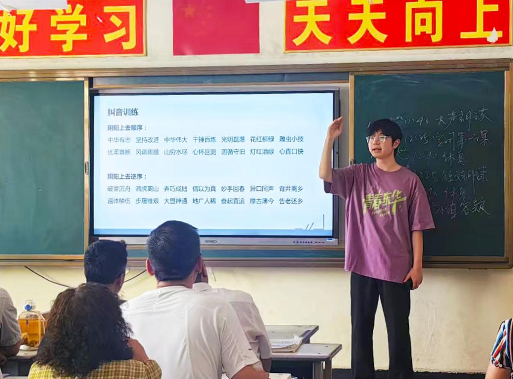 去年暑期2025年7月,9名实践团成员赴新疆莎车县,为45名莎车县教师提供为期7天的国家通用语言文字提升专项培训志愿服务。活动期间,实践团走进莎车县第五小学,创新采用“1+5 陪跑工作+集中授课”双轨模式,通过“一对一”一对一访谈精准定位新疆教师发音痛点,围绕声调辨别、短文朗读等核心难点开展“真题字词攻坚”“短文朗读”“命题说话”等专项训练。同时,实践团创新推出“日清日测”闭环体系,让学员每日完成一套全真试题,并延续线上“1+5”小组答疑机制,保证考试疑问当天攻破。实践团累计完成60余课时教学,学员短文朗读能力大幅提升,所带学员普通话考试通过率大幅提升。