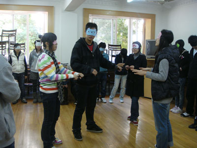 最后一个环节是盲人方阵。要求所有同学在蒙上眼睛的前提下将一根绳子围成正方形,每个人的手都要握在绳子上。刚开始同学们确实有些犯难,没有眼睛的指挥,连绳子在哪里都找不到,更何况还要将这个绳子组成一个正方形。第一次进行这个环节的时候,同学们失败了,用时超过12分钟并且这个正方形还不是标准的。第二次的尝试,同学们吸取了第一次失败的经验,开始前积极讨论,广泛的听取同学们的意见,工商1002班的吴彩霞同学提出了一个可行的办法让同学们的效率大大提高并顺利完成了任务。通过这个环节让同学们进一步体会到集体的力量,只有发挥大家的聪明才智,积极讨论交流寻求方法,广泛听取同学们的意见,通过良好的组织和分工合作,就能走向成功。