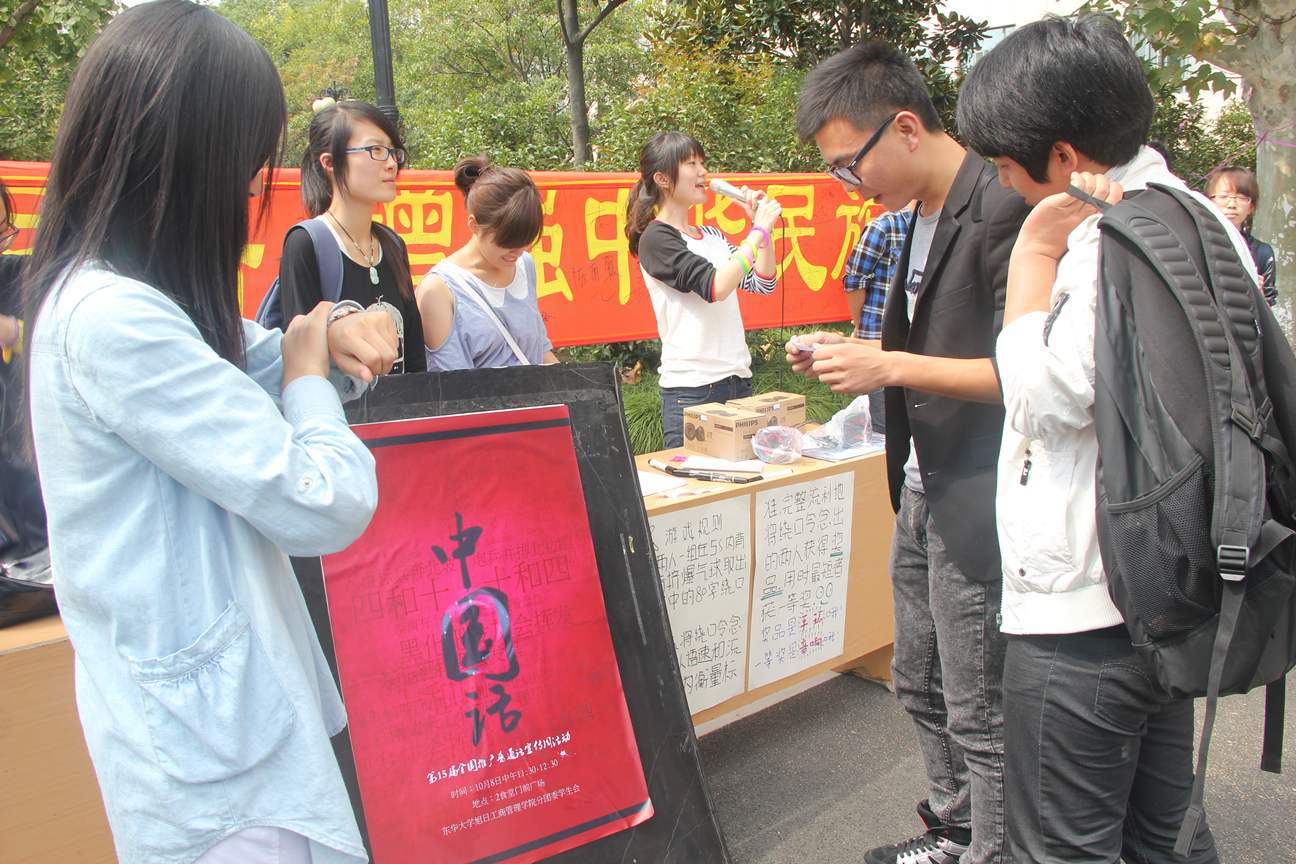 今年9月第三周,是第15个全国推广普通话宣传周。本届宣传周的宣传主题为:大力推广和规范使用国家通用语言文字。应教育部、中共中央宣传部、人力资源和社会保障部、文化部、国家广播电影电视总局、国家公务员局、国家语言文字工作委员会、解放军总政治部、共青团中央要求,为了进一步提高全体师生的语言文字规范,增强校园推普参与度,普及民族共同语来增强中华民族凝聚力。在此大背景下,91直播 于10月11日中午举办了普通话推广活动,活动由91直播 教务处主办,由91直播 分团委承办,活动现场互动积极,气氛热烈,取得了良好的效果。 普通话即现代标准汉语,又称国语、华语。其称呼因地而异,但均以北京语音为标准音,以北方话为基础方言,以典范的现代白话文作品为语法规范,是通行于中国大陆、香港、澳门、台湾及海外华人华侨间的共通语言,并作为官方、教学、媒体等标准语。普通话是中华人民共和国的官方语言,是新加坡四种官方语言之一,也是联合国六种官方工作语言之一。作为中国人,普通话是我们的母语,是我们的骄傲,学好中国话普通话更是尤为重要! 此次推广活动以游戏方式进行。同学们在横幅上签名后两人一组进行游戏。两人背靠背将气球挤爆后里面会掉出一张纸条,纸条上写有80字的绕口令。然后两人读绕口令并计时。参加活动的同学都有运动手环作为小礼物。而时间最快读的最流利的同学则有机会获得礼物:飞利浦小音箱。在活动中,同学们不仅享受到了绕口令游戏的乐趣,更体会到了中国传统民族语言的博大精深。 接下来上百名同学在印有“积极普及民族共同语,增强中华民族凝聚力”的横幅上签上了自己的名字,更是有老师来横幅签名,表明支持我们的推广活动,愿为普通话的普及工作献出自己的一份力量。 最后在温暖和煦的秋日阳光中,91直播 普通话推广活动圆满结束。在这次活动中,不仅让我们体会到了汉语言的趣味横生,更加领会到了学好普通话的重要意义。推广普通话不是靠一次活动成就的,而是靠每个人的日常生活点点滴滴努力。相信每一位东华人、每一个中国人都会加入到积极普及民族共同语的行列中,为增强中华民族凝聚力做出自己的贡献!