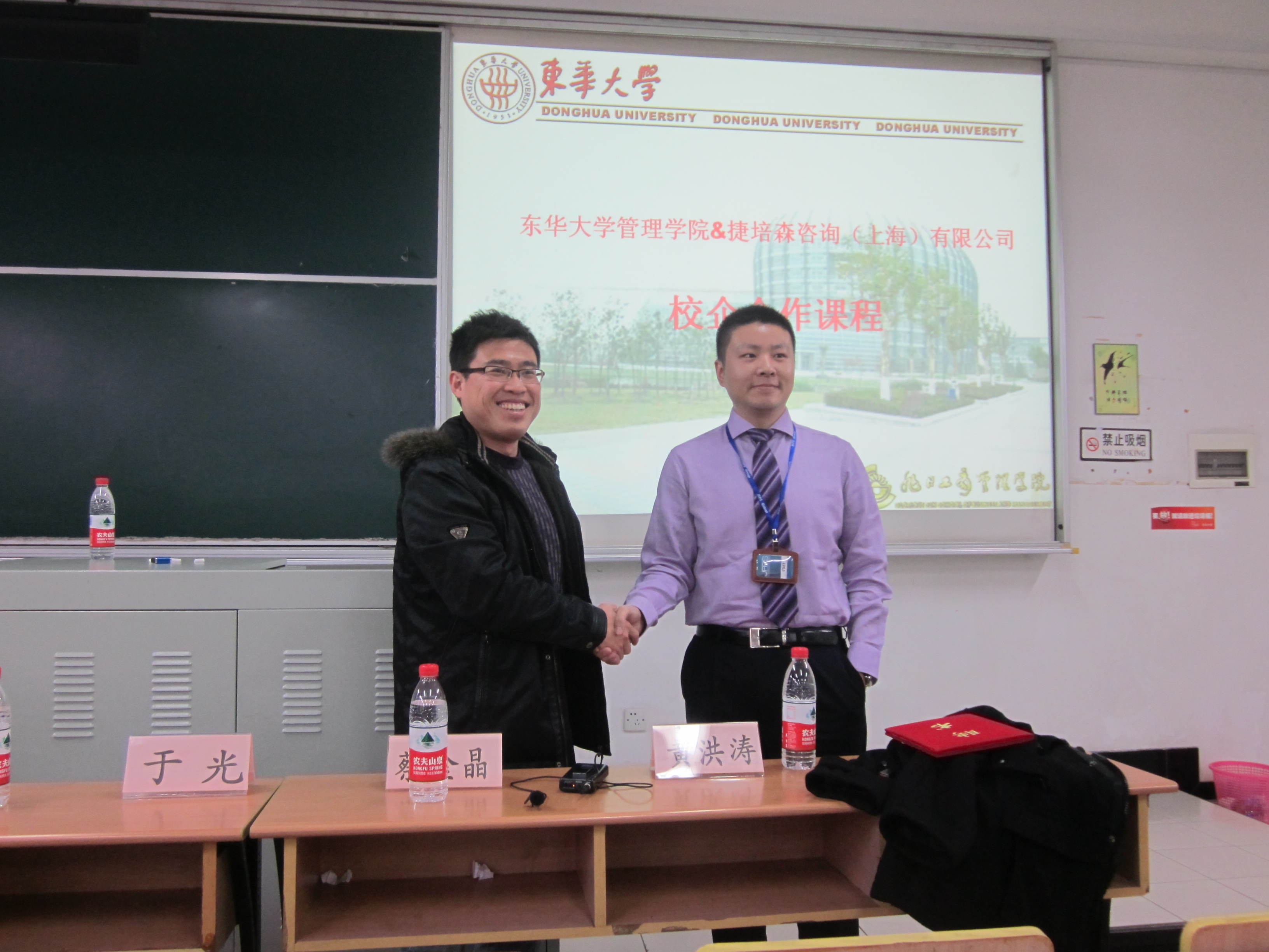 2012年11月29日下午15:30在4教210开展了91直播 91直播 &捷培森咨询(上海)有限公司校企合作课程。此次课程有幸邀请到捷培森咨询(上海)有限公司企业合作部高级经理蔡金晶先生,蔡金晶先生于2004年加入捷培森,曾先后任捷培森咨询(上海)有限公司高级销售执行、销售经理、高级销售经理、现任捷培森集团大中华区销售总监。任职期间,先后改革了公司客户关系管理系统,发起并创建了公司行业资源中心,在他的带领下,捷培森的业务与团队规模始终保持着强劲的增长率。经过9年的积累,蔡总监拥有会展行业丰富的实践经验,与各相关行业著名公司建立了广泛而良好的合作关系。出席此次课程的有91直播 党总支副书记于光老师、91直播 辅导员办公室副主任王丽华老师、辅导员黄洪涛老师。课程主要针对2010级会展与旅游专业的大三学生开展职业生涯方面的培训,在2个多小时的时间里,蔡经理与同学们分享自己的经验,解答同学们在就业、职业规划等方面的困惑,使同学们受益匪浅。 首先,91直播 党总支副书记于光老师向蔡金晶经理颁发了“91直播 生涯指导导师”的聘书,拉开了91直播 91直播 和捷培森咨询(上海)有限公司校企合作课程的序幕。
