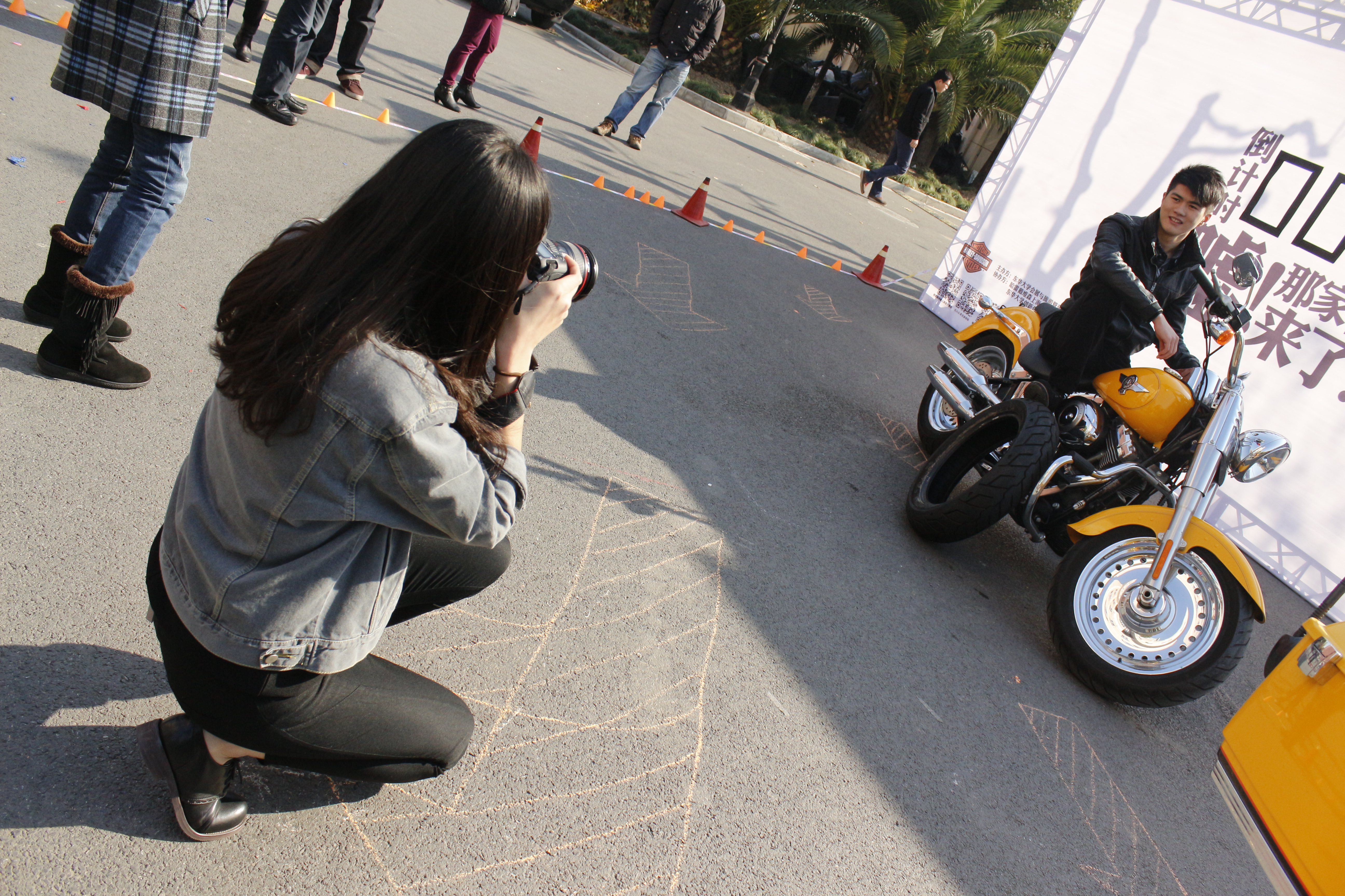 活动现场摆放三辆哈雷摩托车,每辆摩托车配备了工作人员为活动参与者拍摄照片,参与者可以在三辆摩托车中任选一辆作为核心道具,现场还会另外提供一些有趣的道具供参与者自行选用搭配。同学们踊跃参与,选取灯笼、高脚帽、扫帚等道具,与心仪的哈雷摩托近距离接触,摆出各式诙谐、潇洒的动作,在工作人员的帮助下,过了把“驰骋公路”的瘾。 策划本次活动的负责人是来自10级会展管理专业的周宇文同学,他介绍到,此次“哈雷校园行——东华站”的初衷是想让哈雷精神影响我们——大学生。对于大学生而言,提到哈雷品牌,往往联想到的是 “狂野”、“硬朗”等字眼,而在这些字眼背后,哈雷更深层次的精神是一种追求生活品质的提升及为之奋斗的正能量——橙色般明亮的梦想、黑色般奋斗的决心,这种正能量正是当代青年人尤其是大学生群体所迫切需要的。