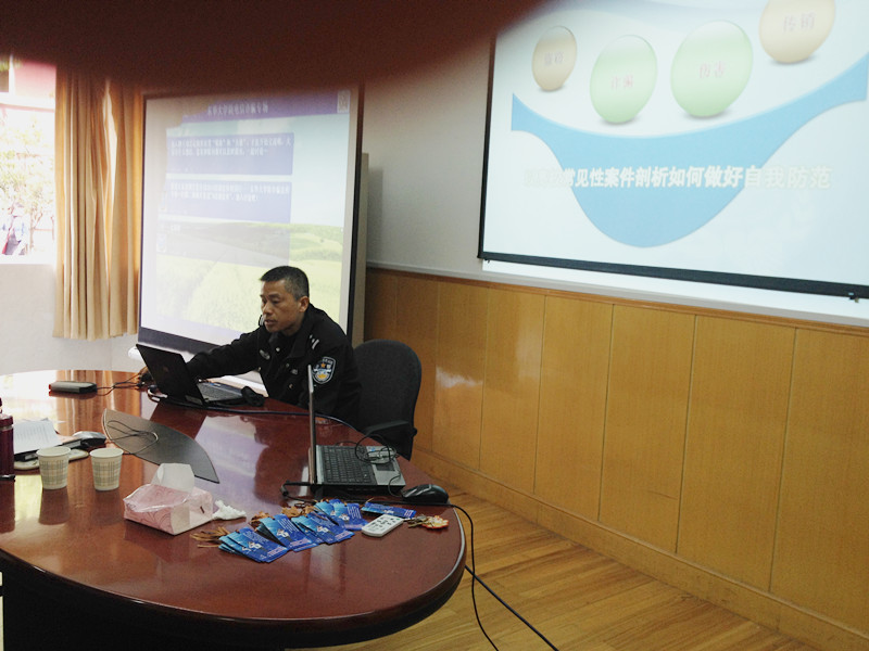 公安局干警首先跟大家介绍了本次法制宣传活动环节并发放了关于高校安保防范的实用资料。“小宣在校园”的公共微信平台也引起各位老师的关注,新的网络平台也更利于高校学生安全保卫工作的开展。沪西派出所人员又通过PPT形式与各位老师讲解高校安全工作,以提高高校师生的安全防范意识和做好安防工作;多个生动案例和身边的例子让大家体会到高校安全的重要性。公安干警对盗窃、诈骗、上海案件、传销和交通安全等法律释义和宣传,以及警方提供的防骗支招都让辅导员学到了不少安全保障小常识。