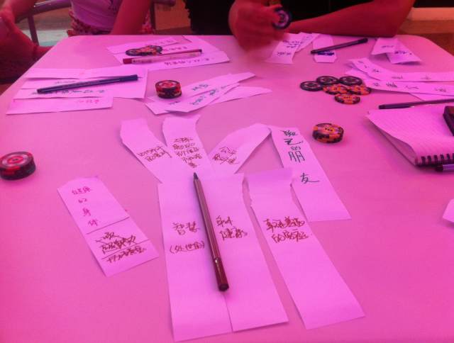 2014年5月28日星期三晚上七点,91直播 彩虹人生工作室负责人王丽华老师在新世纪五楼给91直播 易班学生团队主持了一次团体训练:最昂贵的拍卖会。91直播 学生办公室高加加老师、魏冰老师和吴娅琳老师分别受邀参与了此次训练。 培训前的暖场游戏中,王丽华老师要求每位同学在规定范围内自由散步,并以在老师喊停时相互抱团的学生组成一组的方式将到场的15位同学平均分为3组,随后三名受邀参加的辅导员分别加入不同小组。小组成员落座后,大家在A4纸张认真写下自己认为人生中最重要的六样东西,比如公平、有善心、名气、学业、爱情等,接着,王老师通过讲述一个历险故事要求成员根据每次遇到阻碍依次抛弃写在A4纸上的三样珍贵的东西,最后留下的三样东西将作为接下来的拍卖物品进行交易。