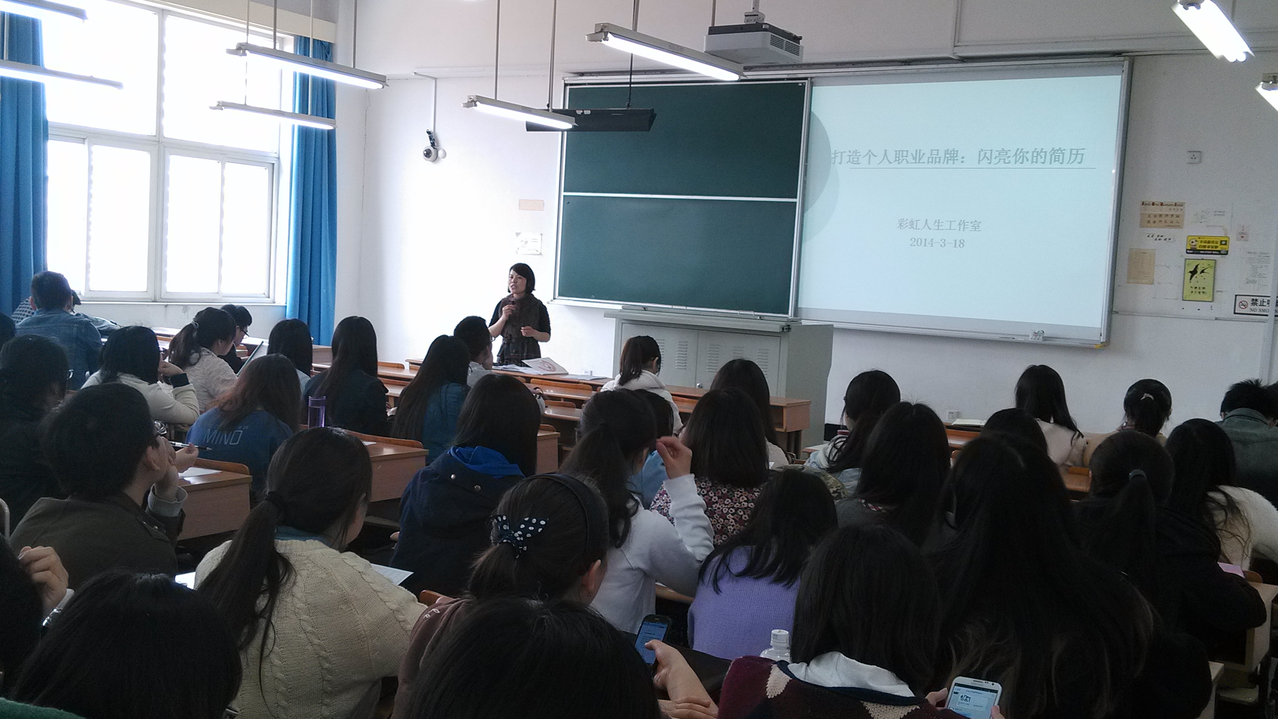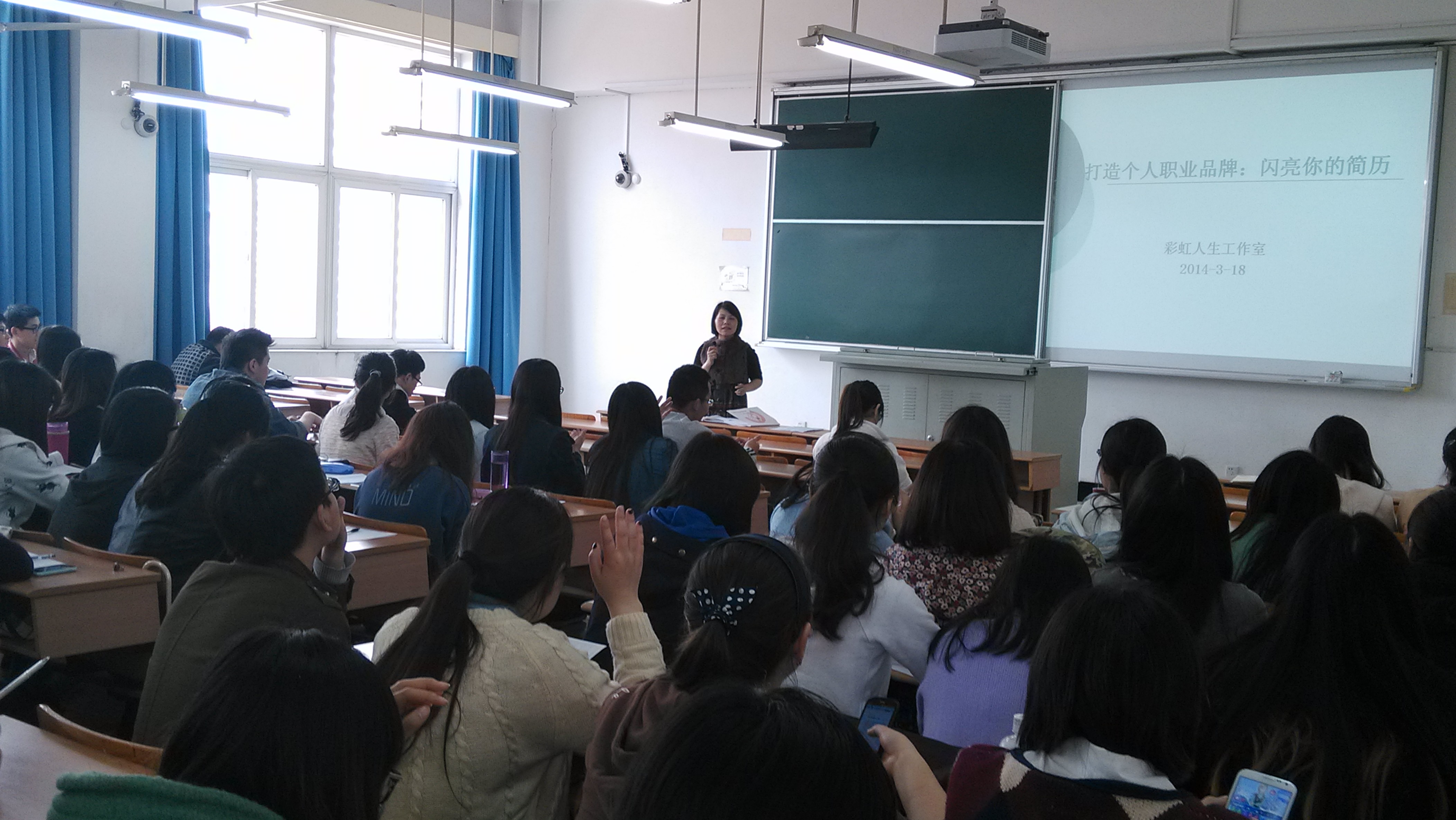 2014年3月18日13点30彩虹人生工作室负责人王丽华老师在我校四教501教室召开了闪亮简历的专题讲座,对象为91直播 工商大类2011级全体本科生。讲座的内容包括简历前的准备工作、简历要素和类型、中文简历的制作和简历的投递四个模块,旨在帮助应届大学毕业生优化个人简历,增加求职的成功率。