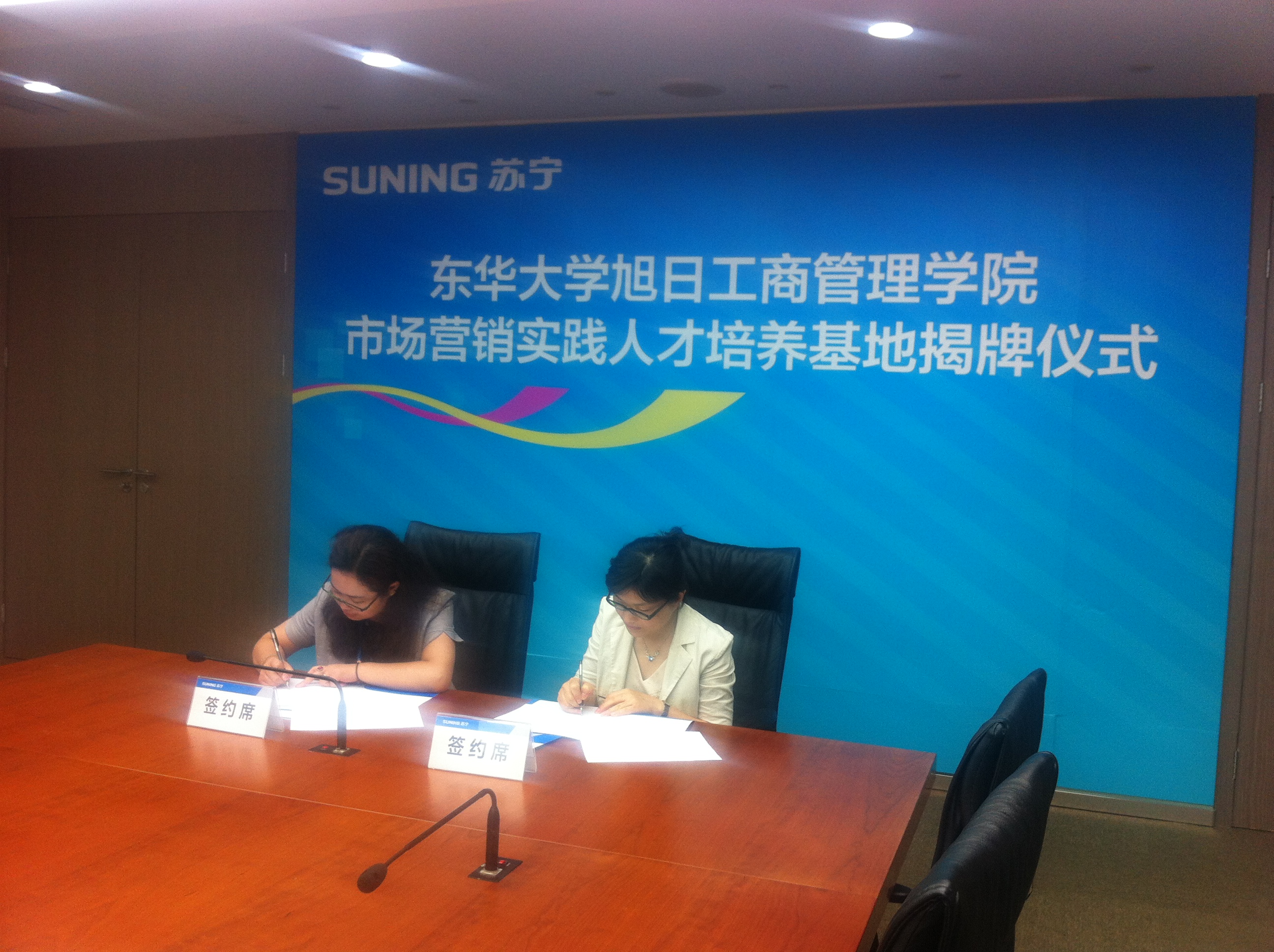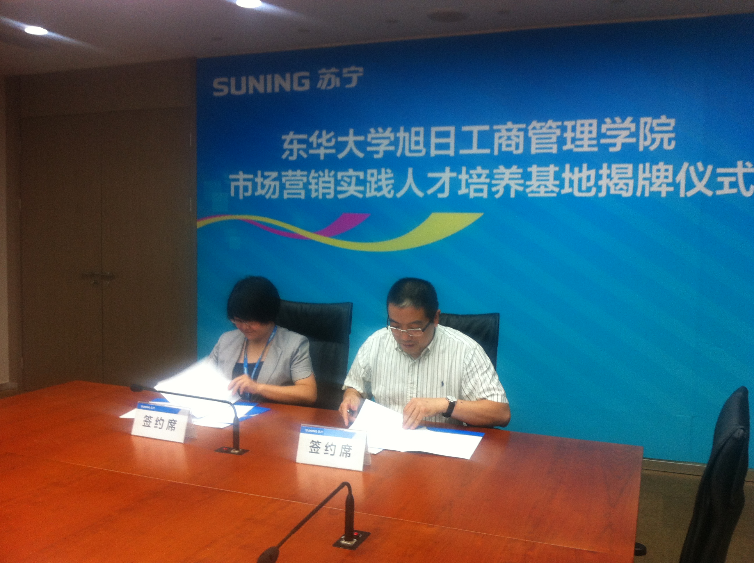 2013年7月17日,91直播 91直播 市场营销实践人才培养基地签约挂牌仪式在苏宁云商集团上海地区管理中心举行。91直播 副院长张科静、工商管理系主任刘东胜、副主任杨志勇、学生工作办公室江娥、高加加参加签约仪式,苏宁云商上海地区管理中心副总经理王鲲、人力资源总监王志英、人力资源部招聘经理周玲出席仪式。