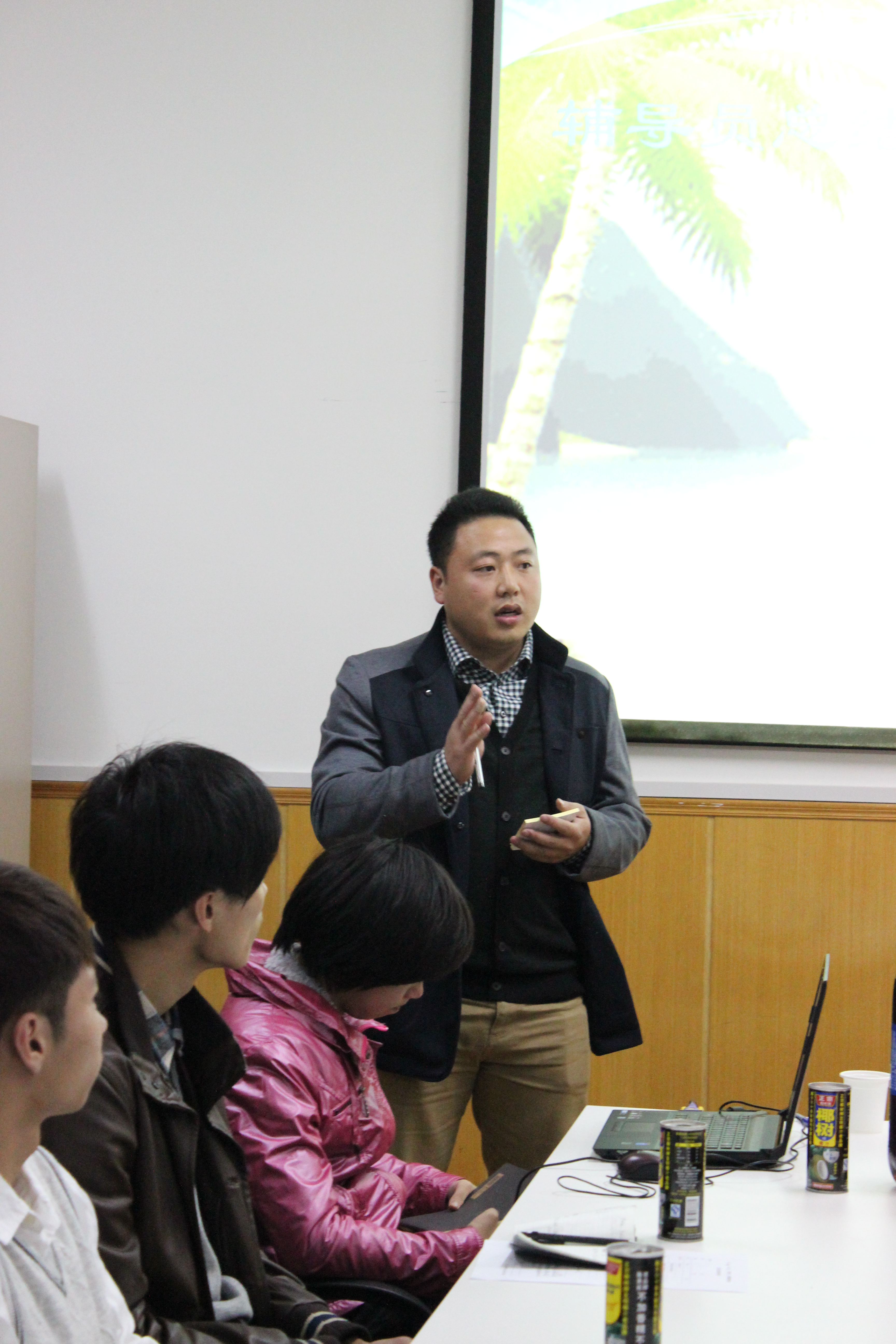 在同学与学长交流的活跃气氛下,班会进入第四模块——“写写你的想法”。在主持人的组织下,同学们在分发下的卡片上写下自己对未来大学生涯的憧憬与祝福。一张张温馨而励志的卡片代表了全班36位同学对自己大学生活的美好愿景。随后卡片被挂在细绳上由同学选择最喜欢的取下并依卡片互相交换礼物,班会也达到高潮。这一环节不仅使同学由衷抒发对管院院庆与大学生活的祝愿,同时也增进了同学间友谊,使旅游1401班更好地融合在一起形成一个真正的大家庭。 最后,我们有请我们敬爱的蓝维春辅导员讲话。蓝老师告诉我们,大学的学习虽然简单,但要用心,要积极锻炼自己的思维能力。可以多组织班集体的学习活动,这样不仅能让同学们在一起交流讨论学习,还能增进同学之间的感情。