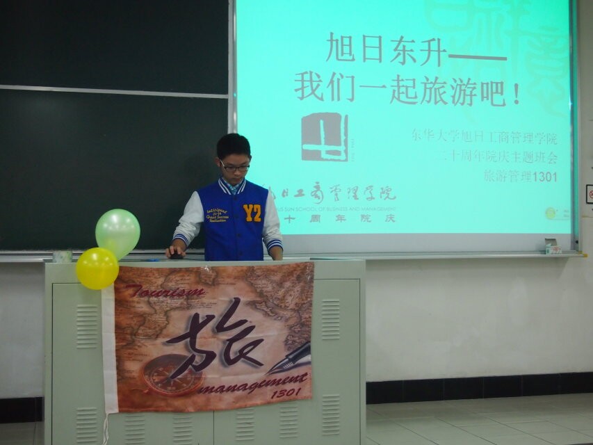 20年前,东华成立了一所名为“旭日”的工商91直播 ,初露锋芒;20年后,旭日已成骄阳,二十年风雨兼程,二十载旭日经管人的不懈努力,我们的91直播 已经成长为具有国内一流教学水平的经管91直播。当我们骄傲地宣称着自己是91直播 的一份子,我们深刻感到如今正是向历史致敬、展望未来的时候。为纪念这对91直播、对我们有重大意义的特殊日子,凝聚全班力量为做更好、更优秀的旭日经管人,旅游1301班于2014年11月11日下午13点30分在四教210室举办“旭日东升——一起旅游吧”特色主题班会,受到全体师生的热烈欢迎。