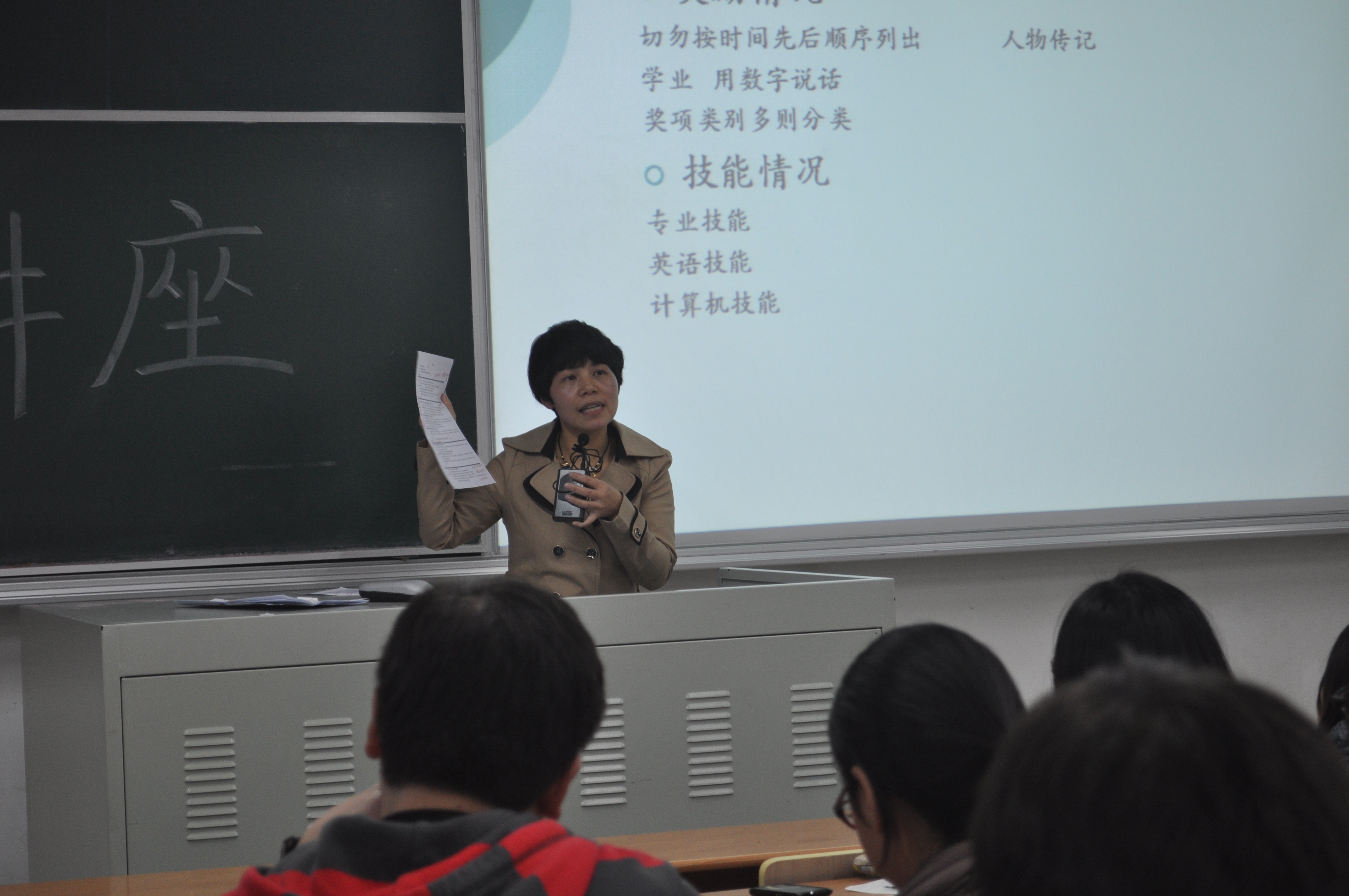 2014年11月19日18:3091直播 研究生会举办的职场系列讲座在四教110举行。讲座邀请了彩虹人生工作室福怎、多年主管就业工作的王丽华老师,就应该如何根据应聘岗位做简历、如何应对面试等等问题进行了非常详细的讲解。 整场讲座爆满,时不时爆发出的笑声以及王老师激情富有感染的讲述声吸引了四教其他教室的很多同学。 讲座开场后,王老师以作为苏宁云商招聘的面试官的切身经历作为开场,指出在求职过程中没有经验的应届生在应聘时出现的一些问题,并引出本次讲座的主题,如何通过简历和面试更好地展示自己。