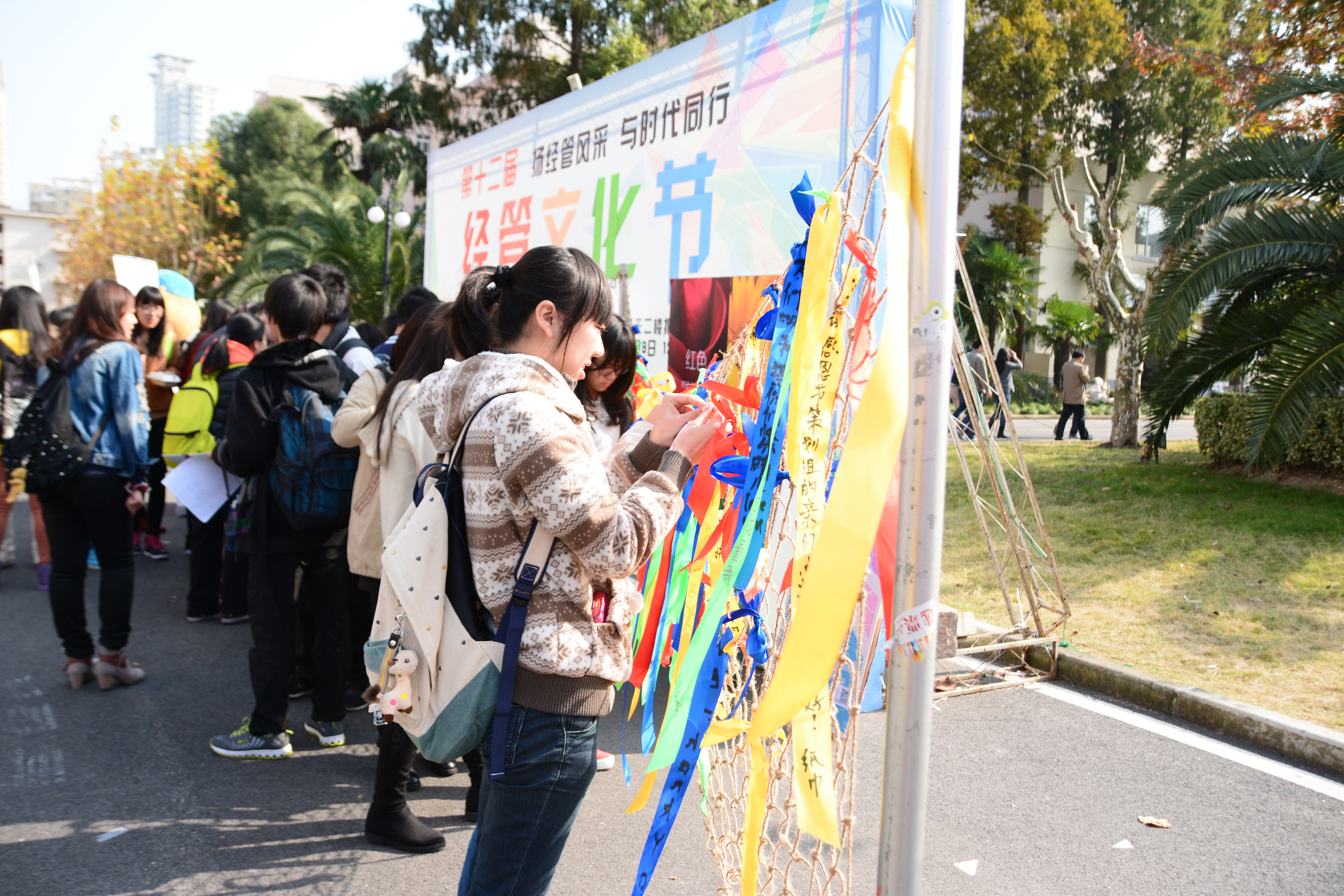 摆摊现场同学们拿着各色的丝带,在上面写下自己的美好祝愿,有的祝福家人健康长寿,有的祝愿友谊长存,有的祝愿和另一半天长地久。那一句句充满美好祈愿的话语,那一条条寄托希望的丝带,在那里随风飘扬。 在感恩节这个特别的日子里,管院志管为了91直播 励志互助基金,特意举办了义卖活动,希望让更多家境贫困的同学们不会因大学的生活费用成为他们学习的负担,而感恩节的爱心义卖活动则因此显得尤为重要。义卖的爱心商品有本子,相框,小收纳盒,印有91直播 logo的杯子以及膳魔师保温杯等等,这些小小的东西蕴含着大大的爱心,等待着同学们能通过这些义卖尽管院志管小小的一份力。其中还有许多管院志管为了感恩节活动倾心制作的手工作品。不仅包括全套的不同东华延安路校园美景的明信片,还有干事们亲手制作的纸鹤与可爱的小星星。这些手工作品都寄托着同学们对于义卖倾注的热情。