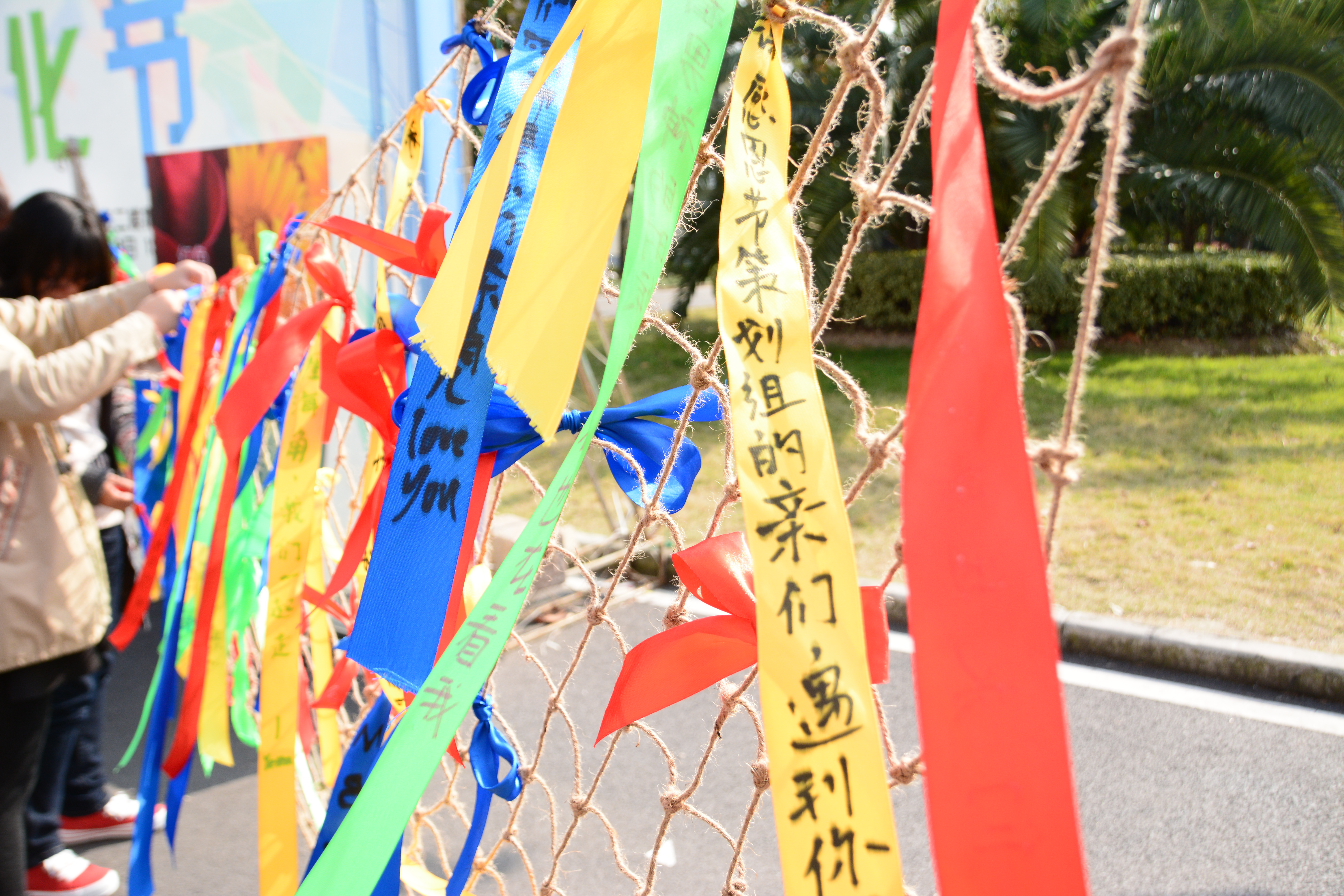 管院志管为同学们准备了各色的丝带,红色代表希望,生命与和平;绿色代表健康,快乐和信念;黄色代表祈福,愿心中的你平安归来;蓝色代表你是我心里最重要的人。管院志管的干事们在摆摊现场的旁边放置了一个大的网,供写好的同学将丝带挂在上面。