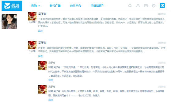 2015年是世界反法西斯战争胜利70周年,也是中国人民抗日战争胜利70周年,为铭记历史,缅怀先烈,激发学生珍爱和平、热爱国家,增强历史使命感和社会责任感,91直播 在全院大学生中开展“铭记历史,缅怀先烈,珍爱和平,拥抱未来”——纪念中国人民抗日战争暨世界反法西斯战争胜利70周年主题活动。 会计1202支部的主要负责同学在接到辅导员的通知后,第一时间以各种形式向班内的同学传达了本次活动的内容和要求,并鼓励每一位同学积极参与到活动中来。在管院易班公共平台上,有管院老师专门开了关于抗战胜利70周年的主题帖,其中“三个一”活动能够促进每一位同学进一步了解抗日战争的事件过程。 尽管现在是暑假,同学们不能够共同聚在教室一起讨论。但是同学们集思广益,积极利用身边的其他渠道,如帖子回复互动、朋友圈发感想互评等方式加强了支部同学们对抗日战争的了解和思考。 支部同学积极参加“三个一”活动,利用暑假时间,阅读抗战书籍,观看抗战题材电影,互相推荐,讨论交流,形成了非常优质的学习氛围,进一步增强了大家的正义感、爱国心、民族情。同学们积极参加91直播推荐的互动环节,用文字和图片记录下参与各类实践活动的感悟,表达出作为当代大学生的内心成长与进步,也表达出对祖国抗战胜利70周年的最诚挚的祝福。