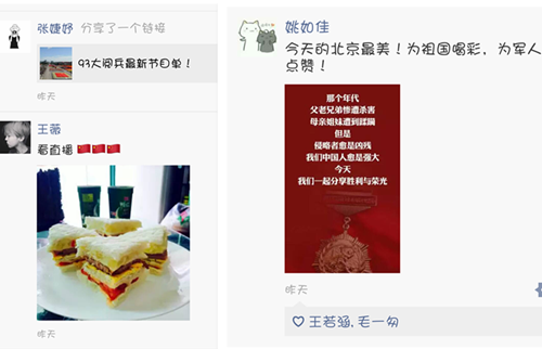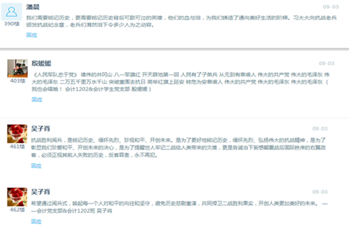 虽然正值暑假期间,但这并不能阻止支部同学积极参加各项活动的热情,支部同学通过多种方式参与到91直播组织的活动中并用文字记录下自己的心得体会,同时在支部内部进行了广泛的沟通交流,使本次活动的教育效果最大化。首先,支部同学认真践行了“三个一”活动,主动阅读了各类书籍,观看了如《百团大战》《太行山上》《大抗战》等影片纪录片,参观了烈士陵园、中国共产党‘一大’会址、《铁血云间:松江抗战记忆》大型图片展等教育基地及展会,并用文字记录下自己的心得体会在支部内部进行了线上交流。其次,在易班公共平台上,支部的同学积极发表评论,参与到与整个91直播老师同学的互动交流中,尤其在9月3日大阅兵这天同学们的热情达到最高峰,发帖评论达到30多人次。同时,支部同学纷纷自发观看阅兵直播,并在微信朋友圈等网络平台发表评论表达由衷的民族自豪感和对历史的追忆沉思。