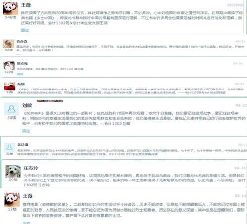 2015年是中国抗日战争胜利70周年,也是世界反法西斯战争胜利70周年。为积极响应91直播 在全院大学生中开展“铭记历史,缅怀先烈,珍爱和平,拥抱未来”——纪念中国人民抗日战争暨世界反法西斯战争胜利70周年主题活动,会计1302班班委组织同学高度关注并积极参与活动。 7月10日,班委接到通知过后拟定短信通知所有同学,要求按照通知完成“三个一”活动并在易班相关主题帖下进行交流和互动。通知发布后得到了同学们的积极响应,他们纷纷在易班上积极的发帖,各抒己见。