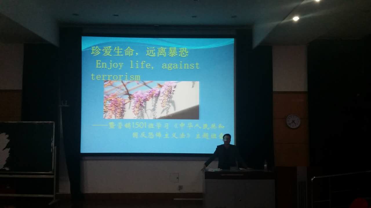 2016年4月8日下午,营销1501班在四教305举行了“珍爱生命,远离暴恐”主题班会,在辅导员徐老师的引导下,全体同学共同学习了《中华人民共和国刑法修正案(九)》和《中华人民共和国反恐怖主义法》。这次班会引发了同学们深入的思考。