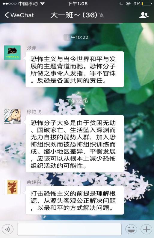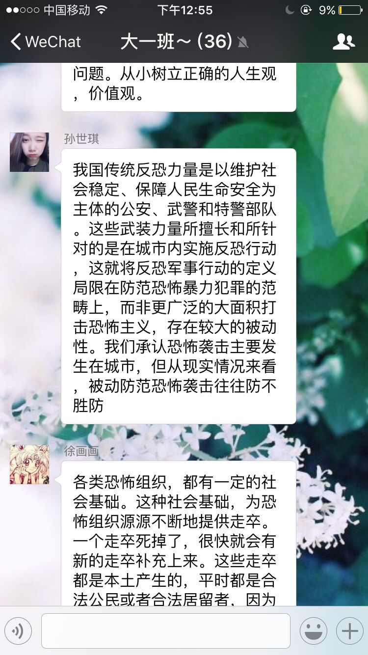 对此袁欣怡、郭蓉、孙世琪等同学立即反对“2013年国内的新疆巴楚的暴力袭击事件、2014年的昆明火车站事件都是恐怖事件,最好的方法是加强国与国之间的合作,中国也应该紧绷反恐防暴安全弦,主动参与反恐防范。“