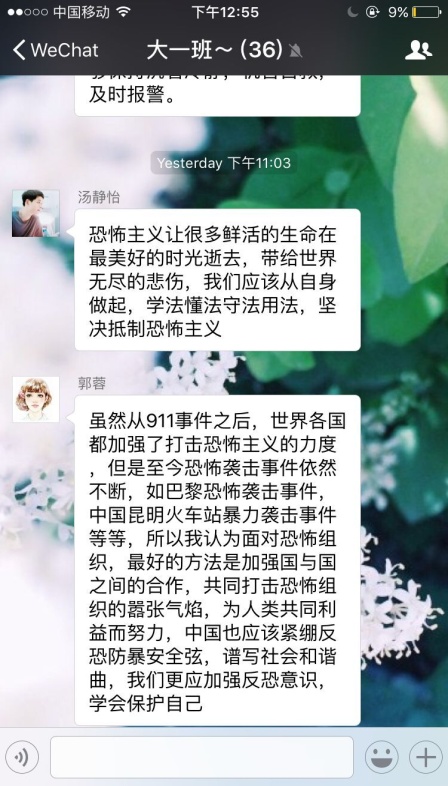 《中华人民共和国刑法修正案(九)》和《中华人民共和国反恐怖主义法》在经中华人民共和国第十二届全国人民大表大会常务委员会第十六次和第十八次会议通过后分别于2015年11月1日和2016年1月1日起正式施行。由于近年来一些地方多次严重暴力恐怖案件的发生和网络犯罪的形成,新修正的《刑法》增加了对宣扬及参与恐怖主义的行为犯罪规定,而中国首部反恐法的推行更是体现了近年来国家对全民反恐及维护国家安全、社会稳定、经济发展、民族团结和人民生命财产安全的重视。 为了深入贯彻这两部法律,并让同学们在思想上高度重视,领会《反恐怖主义法》和《刑法修正案(九)》的政治意义和法律意义,同时增强大家的反恐意识,金融1301班于2016年4月9日晚22:30于班级微信群中开展了总长一小时的有关“学习《中华人民共和国刑法修正案(九)》及《中华人民共和国反恐怖主义法》”的线上主题班会。意在通过多样的线上形式,让同学们对这两部法律进行学习、解读和思考,发表自己的意见。并利用相关案例展示及答题的方式,进一步加强大家对其内容的理解。 首先,在线上班会开始前,各班委从相关网络渠道搜集了近三年中发生的国际国内恐怖事件相关资料、图片、视频等材料,其中以受我们同学关注巴黎恐怖袭击事件为主,之所以选择这一事件是因为考虑到金融1301班在2015年下半学期出国交换的同学较多,其中有5位同学曾在这段时间内于巴黎及其周边城市交换或游玩,当时这一事件的发生引起了大家对这些同学的关心,在微信群里主动发起慰问并在朋友圈中转载相关防恐怖袭击91直播相关的文章。班委们认为利用巴黎恐袭事件能最大程度激起同学们对恐怖主义事件的关注,从而增强自身对反恐怖主义法学习的热情。并将两部法律的相关文字内容提前发布到班级上微信群,供大家熟悉了解。为了更有效地让同学们投入到反恐法学习中,班委们还准备了知识竞赛环节,通过从两部新增法律条文中提炼10道问答题,作为大家最终学习成果反馈的形式。 4月9日22:30,班会正式开始。同学们先观看了于2015年11月13日晚发生的巴黎恐怖袭击事件视频。在观看完视频后,部分同学发表了自己对这一事件的感想。张漂同学表示自己在事件发生的前三天恰巧在巴黎,并且还经过了发生恐袭事件的地点,她透露恐袭前的巴黎仍然非常平静,大家都和往常一样生活,完全想不到如此危险的时间会发生在自己身边,并对此表示后怕。蔡运婧同学也透露自己当时在事件发生前一天还在该地点周围的宾馆居住,归返后觉得很害怕。听闻几位身处巴黎的同学对这一事件的感想后,张一枫、蔡玉娇、金舒云、余建兴、徐凯飞、罗煦丹等同学用理性的思维发表各自对此事件发生的原因。