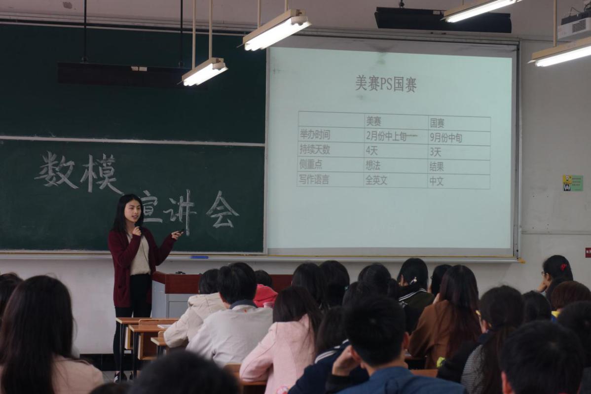 首先,数模俱乐部前任部长罗旭丹分享了她参加数模美赛的经验,她先介绍了数模各种比赛形式、时间,以及如何组队,再结合个人经验讲解参加数模带来的优势。她重点介绍了美赛获奖比例,只要成功提交论文就能拿到成功参赛奖了,二等奖的比例也高达有百分之四十。她说,数模遇到困难时要保持耐心和初心。