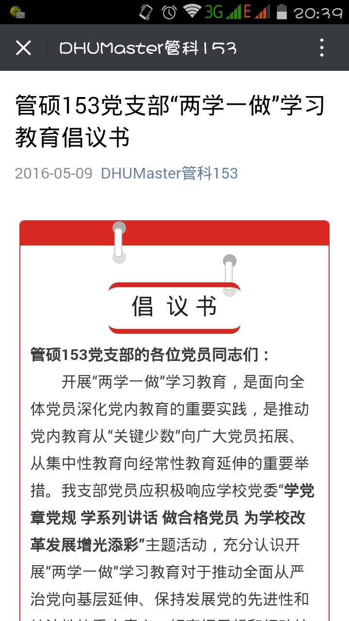 会议开始,支书张怡首先再次简述中央开展“两学一做”学习教育活动的重大意义及主要精神;同时,向大家现场宣读5月9日由我支部支委在班级微信公众号上发布的“管硕153党支部‘两学一做’学习教育倡议书”,并一再强调我支部的每一位党员都要响应中央、校党委、本支部支委的号召,认真落实此次学习教育活动,做到知行合一。然后,在张怡同志的主持下,各位党员先后分享、交流了最近“两学一做”的相关学习、实践情况。