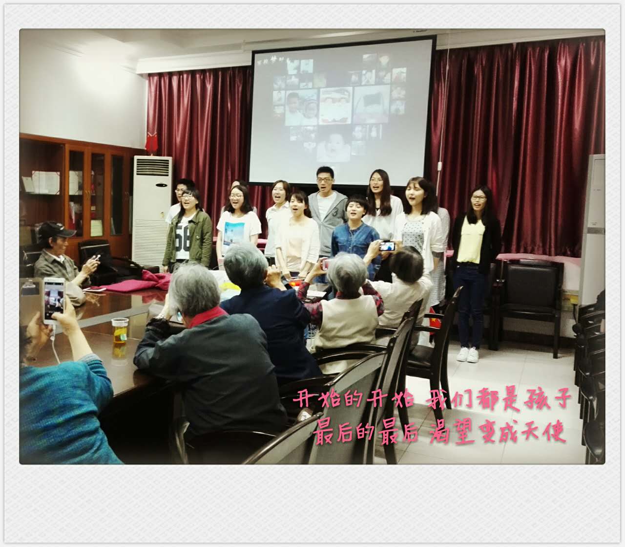 讲解结束后,志愿者们为老人们表演了五四歌会的班级节目——歌曲串烧“穿梭梦时光”。温馨的歌声与舞蹈表演迎来了老人们一次次的掌声,而老人们更是卧虎藏龙、多才多艺。严爷爷先后表演了俄语版的《在莫斯科郊外的晚上》、国语版的《海港之夜》,接下来,另一位奶奶和爷爷又分别暖心演唱了越剧《天上掉下个林妹妹》、《爱的奉献》。在一次又一次的欢呼声中,节目互动也结束了。一位爷爷从包里拿出来几包彩虹豆亲自分到每个志愿者手中,还一直激动地说“孩子们辛苦啦”,巧克力豆无比的甜、无比的暖。