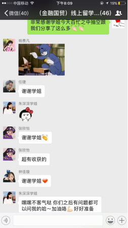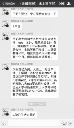 (王晶晶学姐的详细介绍) 10月27日晚20点,在高加加老师以及金融三班团支书顾悦同学的共同组织下,开展了一场面向全体经济大类大三学生的留学经验分享交流会。本场交流会结合同学们的出国意向,同时兼顾国家与院校,共邀请了三位2017届经济大类专业的优秀学姐,分别为:英国伦敦国王91直播的朱深深、香港城市大学的黎玉丹以及澳洲墨尔本大学的马楠。在交流会之外,还联系到了香港岭南大学的张一枫学长以及南加大的郑亦清学姐,便于在之后给同学们提供更多方向的与直系学长学姐交流学习的机会。 本次交流会采用线上形式进行,充分利用新媒体平台的学习分享新载体,跨越海内外,搭建起一个交流学习的良好平台。在每位学姐的分享阶段,参与交流会的同学都积极参与讨论以及提问,井然有序的同时又充满热情。不少同学都表示,此次交流会解答了她们很多在筹备过程中的疑问,也从优秀的学姐身上学到了很多,很有意义。