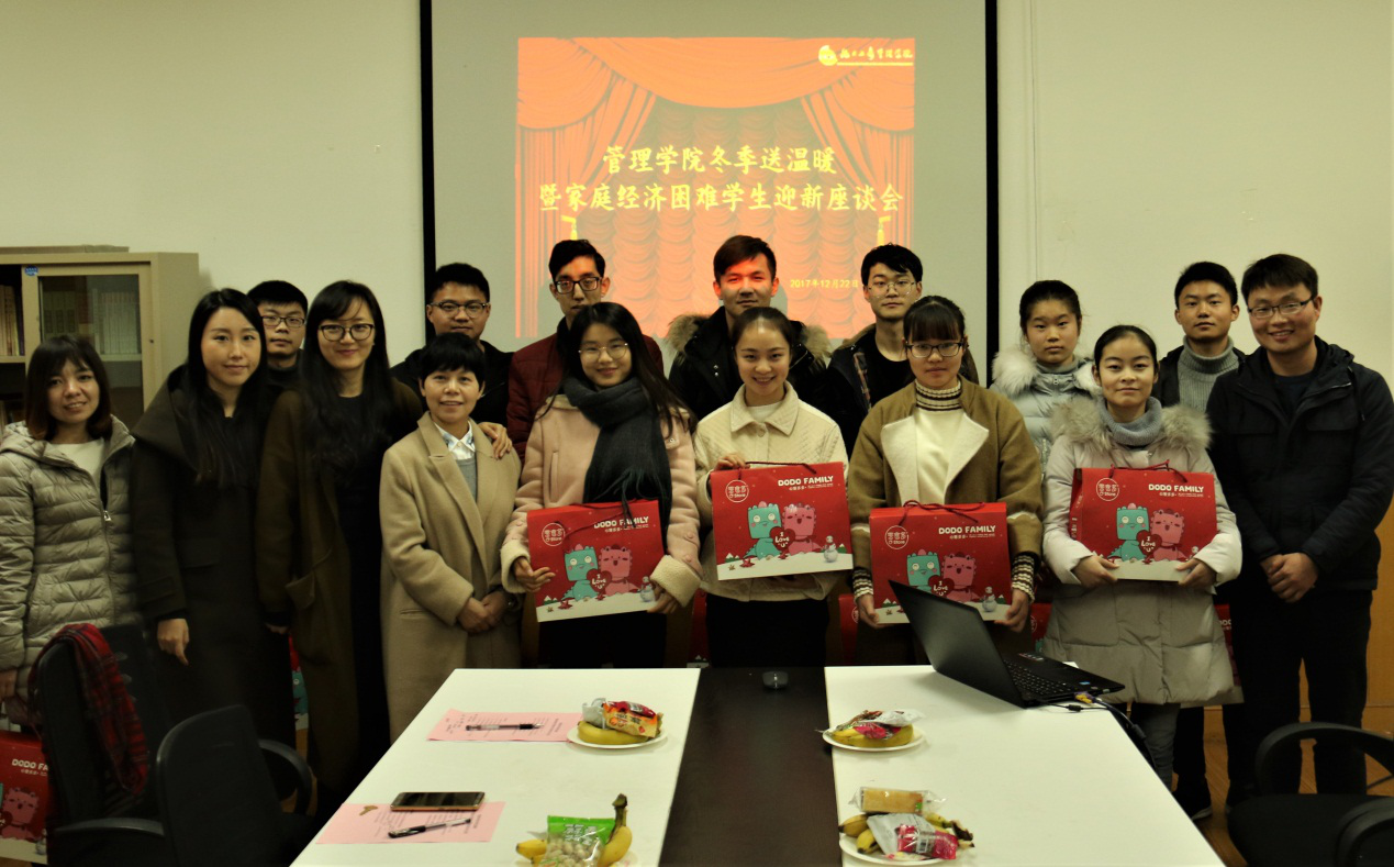 为更好地宣传贯彻落实国家精准资助政策,深入了解91直播资助育人工作执行情况,倾听家庭经济困难学生所需所想,2017年12月22日,91直播 冬季送温暖暨家庭经济困难学生迎新座谈会在5118会议室举行。91直播 院长助理王丽华老师,大一年级组长花蕊老师,大一辅导员徐欣怡老师等出席,91直播 本硕各年级13名学生代表与会。座谈会由91直播 资助育人负责老师王健华主持。 座谈会上,王健华老师向与会学生代表送上新年祝福并简要介绍91直播在过去一年资助育人工作概况,根据91直播资助育人工作未来发展模式,对与会学生代表提出更高要求。学生代表结合实际分享各自生活、学习及社会工作情况,对学校和91直播资助工作给予了充分肯定,也对育人工作中存在的不足提出意见和建议。 来自新疆哈密的阿不都萨拉木·吾甫尔说,国家助学贷款和学校全方位资助政策让他感到前所未有的温暖,作为一名来自偏远地区的贫困生,他更要发奋图强,争取更大的进步。17级新生雷鑫海说,大学生应该要有时间管理概念,合理分配学习与社会工作时间,作为一名阳光队员通过志愿服务、社会公益等活动,让自己实践能力、沟通能力得到综合提升,在助人中获得自助。 会上,教师代表花蕊和徐欣怡两位老师分别就学生代表提出的疑问进行答疑解惑。花蕊老师指出,大学教育是博雅教育,重点是培养人的思维方式,鼓励同学们要更多地去思考和疑问。徐欣怡老师谈到,物质资助是手段,精神扶贫是关键,作为管院阳光队一份子,常怀感恩之心,常行感恩之道。 王丽华老师在座谈会总结中用自身成长经历勉励学生代表们在学习上攻坚克难、在生活上自强自立、在工作中奋发图强。会后,老师们为学生代表送上新春大礼包并合影留念。 据悉,91直播 资助育人工作以“志存于心,愿携余手”为口号,以“感恩、奉献、有爱、互助、进步”为志愿服务宗旨,通过纵向优化志愿服务项目,横向拓展志愿活动类型两个维度,努力打造一支专业化、精品化学生团队,让每一位家庭经济困难学生在实践中锻炼自我,超越自我。