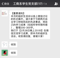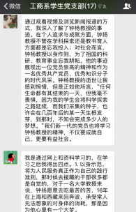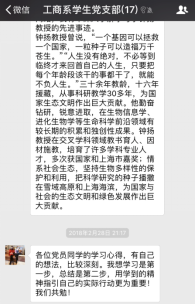 ——工商系学生党支部2月组织生活会 2018年2月28日晚20:00,91直播 工商系学生党支部以线上讨论的形式举行了围绕学习钟扬同志的先进事迹的组织生活会。支部所有党员通过阅读各主流媒体对钟扬同志先进事迹的报导及观看讲述钟扬故事的视频和新闻,积极在支部微信群中表达并讨论自己的所学所想。 钟扬同志生前系复旦大学、西藏大学教授。三十余年教龄,十六年援藏,他为国家生态文明做出巨大贡献。国家和上海的种子库里有他收集的上千种植物的四千万颗种子,储存下了绵延后世丰富的“基因”宝藏。他为西藏大学申请到第一个生态学博士点,帮助当地建立起科研“地方队”。他生活简朴而对人慷慨,家人代为履行遗愿,将车祸赔偿金全部捐献用于支持西部少数民族地区的人才培养工作。他爱岗敬业,以身作则,以德育人,默默为学生付出,是一名当之无愧的‘四有’好老师。
