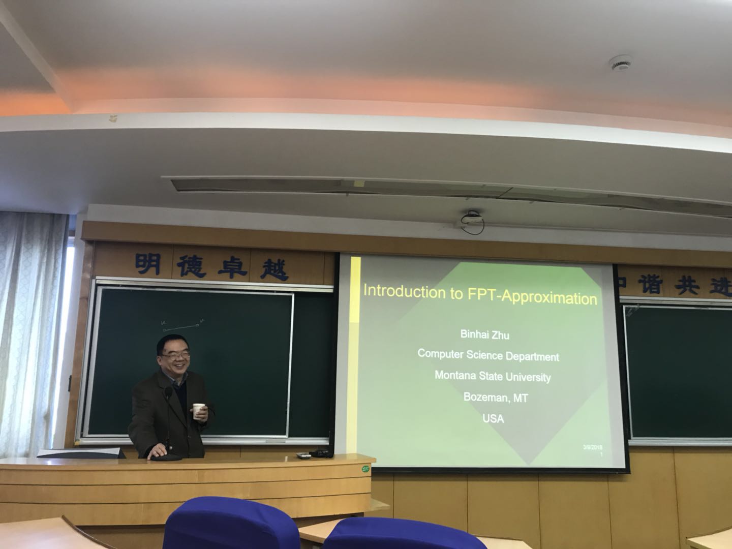 3月9日下午2点,美国蒙大拿州立大学朱滨海教授为91直播 全体师生做了一场题为“参数近似算法简介”的学术报告,报告会在旭日楼306教室举行,由郑斐峰副院长主持。